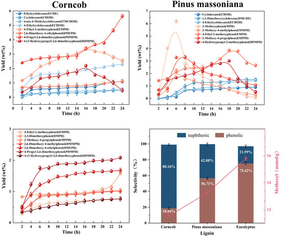 This difference is mainly attributed to the structural differences in the three types of lignin. EL belongs to S/G type lignin, with a higher proportion of S units and more methoxy substitutions on the aromatic rings. Previous studies have confirmed that the presence of methoxy groups enhances the stability of benzene rings [28]. This reduces the probability of hydrogenation reactions. As a result, highly selective phenolic products are produced. PML is mainly G-type lignin. It has a higher proportion of C-C bonds in the G unit. This results in a more complex structure and limited cleavage of C-O-C bonds. Under reaction conditions, some aromatic ring side chains undergo hydrogenation. This results in a distribution of phenolic and cycloalkane products. These products are close to each other in terms of their distribution. In contrast, CL primarily consists of H-type units. It has the lowest methoxy content in its structure. CL also has a high proportion of C-O-C bonds that are easily broken. Under catalytic hydrogenation conditions, phenolic rings are more readily reduced to naphthenes. This increases the selectivity for naphthene products and results in the lowest proportion of phenolic products.