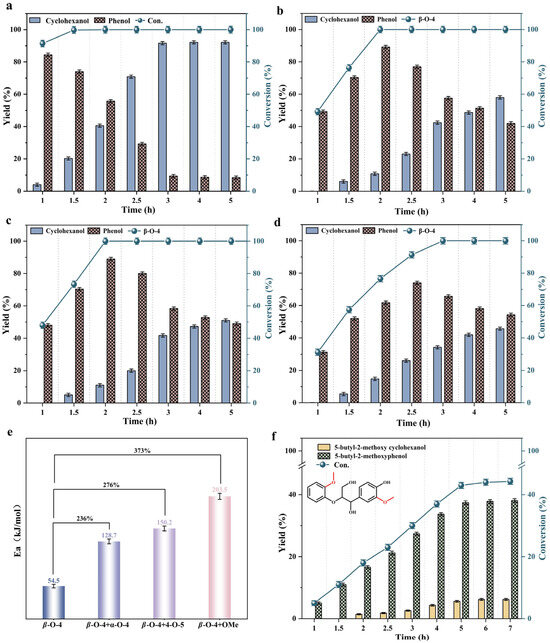 Mixed ether bonds within 5 h: (a) β-O-4; (b) β-O-4 + α-O-4; (c) β-O-4 + 4-O-5; (d) β-O-4 + methoxy group showing the conversion rate of β-O-4 and its product distribution; (e) activation energy of β-O-4 in mixed ether bonds; (f) depolymerization conversion rate and product distribution of methoxy-substituted β-O-4 dimer model compounds within 10 h. Reaction conditions: 0.05 mmol substrate, 1 g/L catalyst, 250 °C, and 20 mL isopropanol.