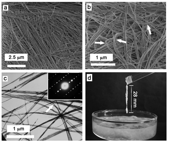 (a–c) Flexible ultralong HAP nanowires synthesized by the calcium oleate precursor solvothermal method: (a,b) scanning electron microscopy (SEM) images; (c) transmission electron microscopy (TEM) image. (d) Digital image of a long macroscopic fiber consisting of ultralong HAP nanowires. The arrows in (b,c) show the bending of ultralong HAP nanowires. Reproduced with permission from ref. [17]. Copyright 2014, Wiley-VCH.