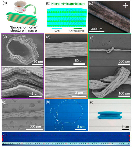 Characterization of the as-prepared HAP/PAAS ribbon fiber. (a) “Brick-and-mortar” structure of natural nacre. (b) Schematic illustration of the ribbon fiber with a nacre-mimic structure. (c) Polarized optical microscope image of the HAP/PAAS gel fiber. (d,e) SEM images of the cross-section (d) and surface morphology (e) of the ribbon fiber. (f) SEM images of a knot of the ribbon fiber. (g) SEM image of a rope prepared by twisting two ribbon fibers. (h) Digital image of a rope obtained by twisting 12 ribbon fibers. (i) Digital image of a long ribbon fiber collected on a winder. (j) Digital image of a long straight ribbon fiber. Reproduced with permission from ref. [40]. Copyright 2018, American Chemical Society.