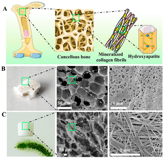 (A) Schematic illustration of the structure of cancellous bone. (B,C) The microstructure of cancellous bone (B) and the cancellous bone-inspired aerogel assembled by ultralong HAP nanowires (C). Reproduced with permission from ref. [42]. Copyright 2018, American Chemical Society.