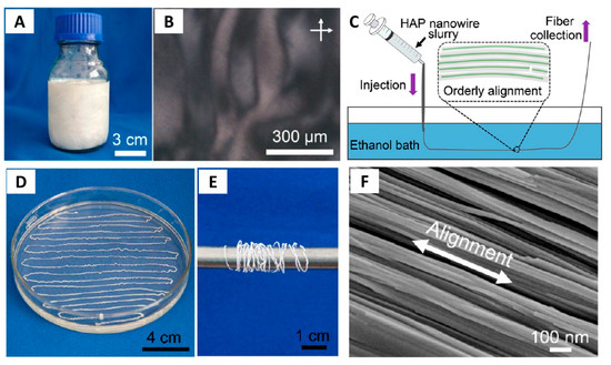In a subsequent work of the authors’ research group, the wet spinning (injection) method was used to prepare the highly ordered macroscopic ribbon fiber that could inherit the orderly structure of the liquid crystalline HAP nanowire slurry (Figure 7C) [40]. The solvothermal product slurry containing ultralong HAP nanowires was loaded into a syringe and slowly injected into ethanol. The continuous and long macroscopic ribbon fiber consisting of highly ordered ultralong HAP nanowires and with a desired length could be obtained as long as the solvothermal product slurry was sufficiently provided. For example, a macroscopic ribbon fiber composed of highly ordered ultralong HAP nanowires with a length of several meters was prepared, and it exhibited a high flexibility and could be wound around a metal rod (Figure 7D–F).