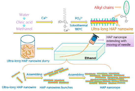 We proposed a surface-induced instant self-assembly process for the mechanism of the orderly assembly of ultralong HAP nanowires during the wet spinning process (Figure 8) [39]. In the reaction system, oleic acid molecules can adsorb onto the surface of ultralong HAP nanowires through interactions between carboxyl groups of oleic acid molecules and Ca2+ ions of ultralong HAP nanowires, with their alkyl chains exposed to the mixed solvent. When the solvothermal product slurry containing ultralong HAP nanowires is injected into anhydrous ethanol, the injection shear force induces ultralong HAP nanowires to align directionally parallel to each other. The components of water, methanol (or ethanol), and oleic acid molecules in the solvothermal product slurry diffuse into ethanol. Because alkyl chains of oleic acid molecules are incompatible with the polar solvent (ethanol, methanol, and water), ultralong HAP nanowires are separated out from the solvent. During the process of solvent diffusion, oleic acid molecules adsorbed on the surface of ultralong HAP nanowires may modulate the self-assembly process of ultralong HAP nanowires by the “alcohol–oleic acid” interaction, expelling ultralong HAP nanowires to form aligned nanowire bundles. Because HAP nanowires have ultralong lengths, each ultralong HAP nanowire may exist in different aligned nanowire bundles. Therefore, ultralong HAP nanowires are linked to each other by this connection, instantly forming the macroscopic fibers with the long-range continuously ordered structure [39].