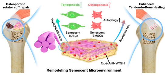 - Song, W.; Liu, W.; Li, S.Y.; Yu, Y.; Xu, H.; Shi, T.; Yu, H.P.; He, Y.; Zhu, Y.J.; Yu, W. Remodeling the Senescent Microenvironment for Promoting Osteoporotic Tendon-to-Bone Healing via Synergizing Senolytic Quercetin and Aligned Nanowire-Structured Hydrogels. ACS Nano 2025, 19, 18364–18385. [Google Scholar] [CrossRef] [PubMed]