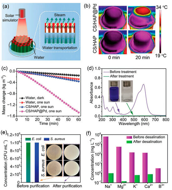 Inspired by this guideline, Chen et al. [80] developed a biomimetic hydrogel composed of highly ordered ultralong HAP nanowires, MXene, and hydrophilic hyaluronic acid methacryloyl, and it had a multi-scale-ordered hierarchical architecture which mimicked the fish gill structure. The highly ordered alignment of ultralong HAP nanowires was realized at multiple scales, from the nano-scale to the micro-scale to the macro-scale and from 1D to 2D to 3D in the biomimetic hydrogel. The biomimetic hydrogel could be used as a solar water evaporator for efficient seawater desalination (Figure 5). The as-prepared biomimetic hydrogel water evaporator showed high efficiency of photothermal conversion, low water evaporation enthalpy, excellent heat management capability, and high solar water evaporation performance. The water evaporation enthalpy reduced from 2431 J g−1 (pure water) to 1113 J g−1. As a result, the biomimetic hydrogel water evaporator exhibited a high water evaporation rate (6.278 kg m−2 h−1) and a high energy conversion efficiency (129% for pure water) under one sun illumination (1 kW m−2). Furthermore, owing to the ordered channels between ordered ultralong HAP nanowires that could accelerate the salt–water exchange and promote the salt-ion reflux, the as-prepared biomimetic hydrogel evaporator could achieve a water evaporation rate of 4.931 kg m−2 h−1 using real seawater samples. The water evaporation rate was maintained at 3.109 kg m−2 h−1 even in a saturated NaCl solution for at least 10 h without significant degradation, and no solid salt deposit was observed on the evaporation surface.