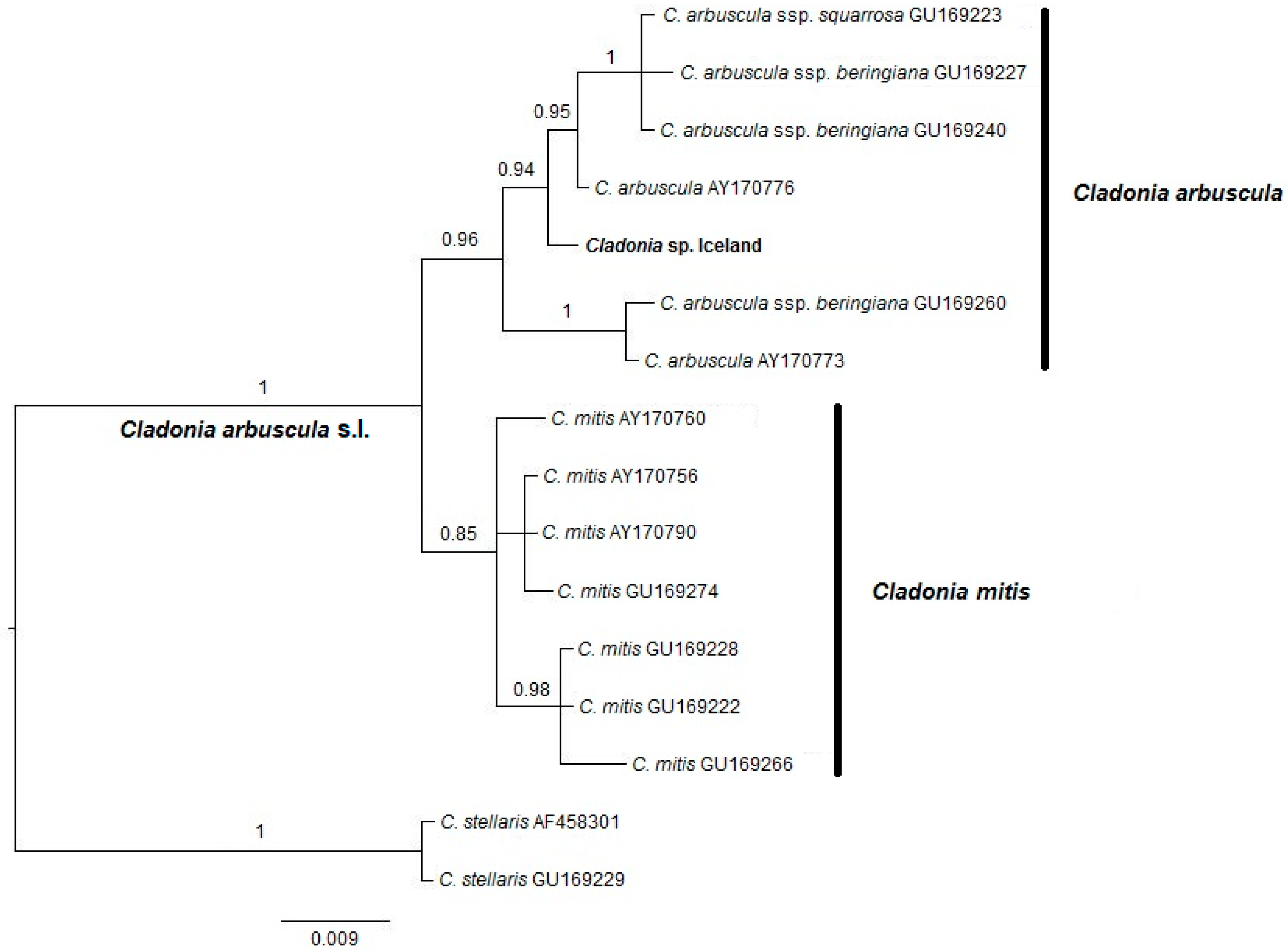 - Myllys, L.; Stenroos, S.; Thell, A.; Ahti, T. Phylogeny of bipolar Cladonia arbuscula and Cladonia mitis (Lecanorales, Euascomycetes). Mol. Phylogenet. Evol. 2003, 27, 58–69. [Google Scholar] [CrossRef]