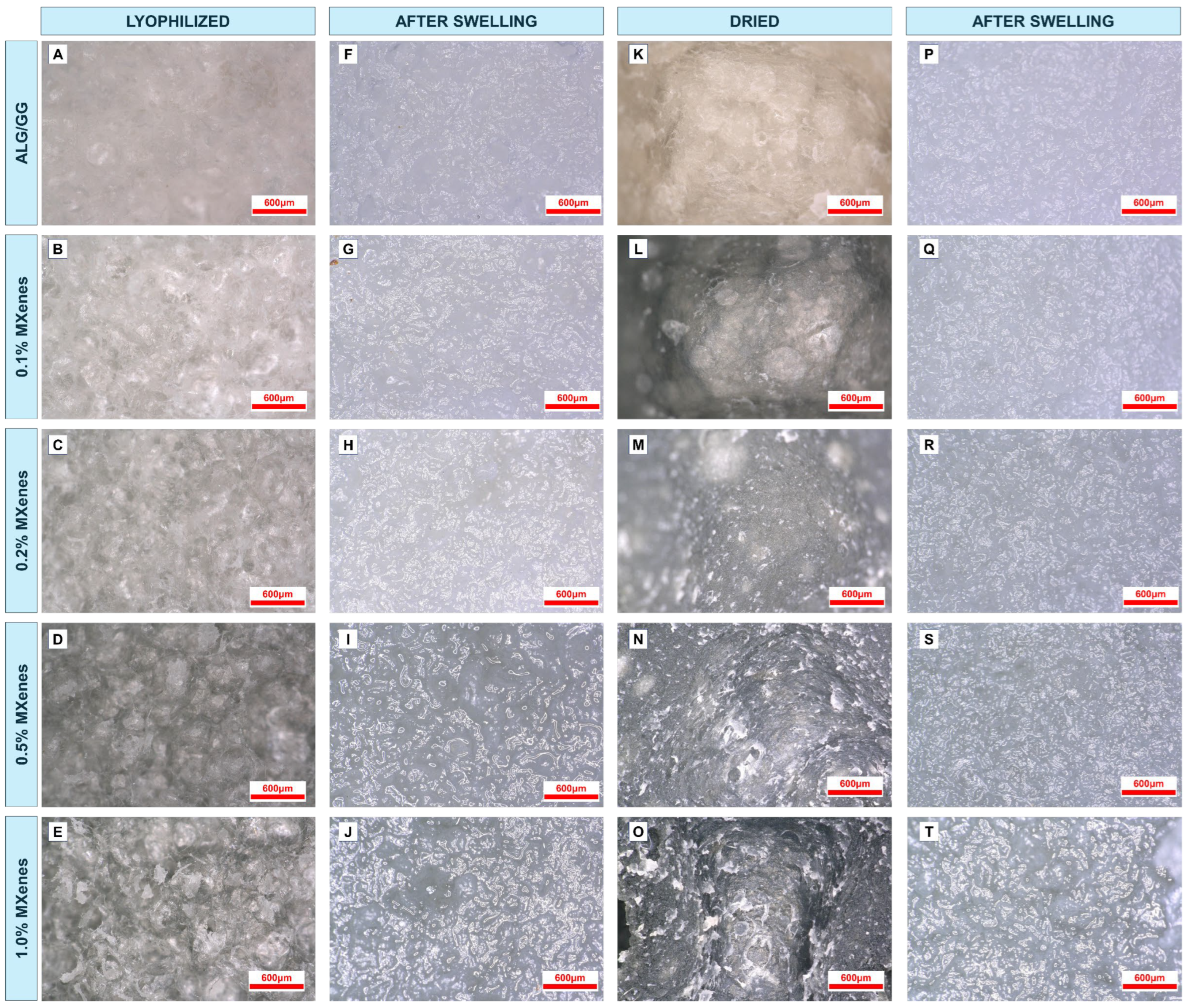 Figure 3F–J) indicate the changes in the material macrostructure as they undergo water absorption process. Freeze-dried hydrogels retain their original (given) shape, the pores are open and well distributed with similar sizes, and they are not collapsed and show their original shape. Additionally, the pore walls are thin and well developed. The ALG/GG sample, which does not contain MXene, is white, whereas with increasing MXene concentration, the color of the material darkens, and its color becomes uniformly grey, which indicates good dispersion of the nanoadditives within the matrix. In the 1.0% MXene sample (