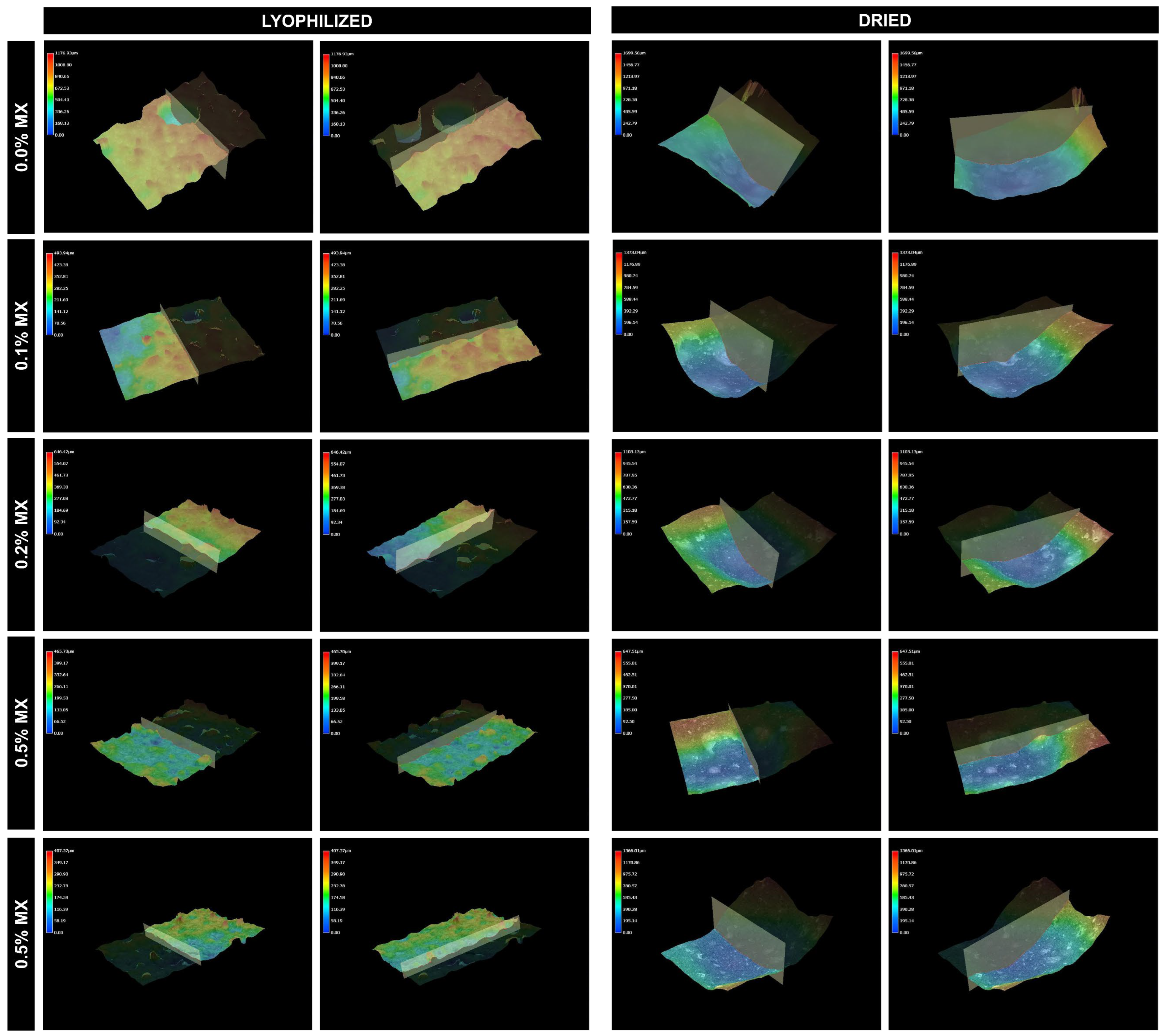 Optical microscopy, performed on a Keyence VHX-900F instrument (Mechelen, Belgium), was used to evaluate the morphology of the samples before and after swelling process and also to determine the surface roughness of xerogels using the 3D scanning technique.