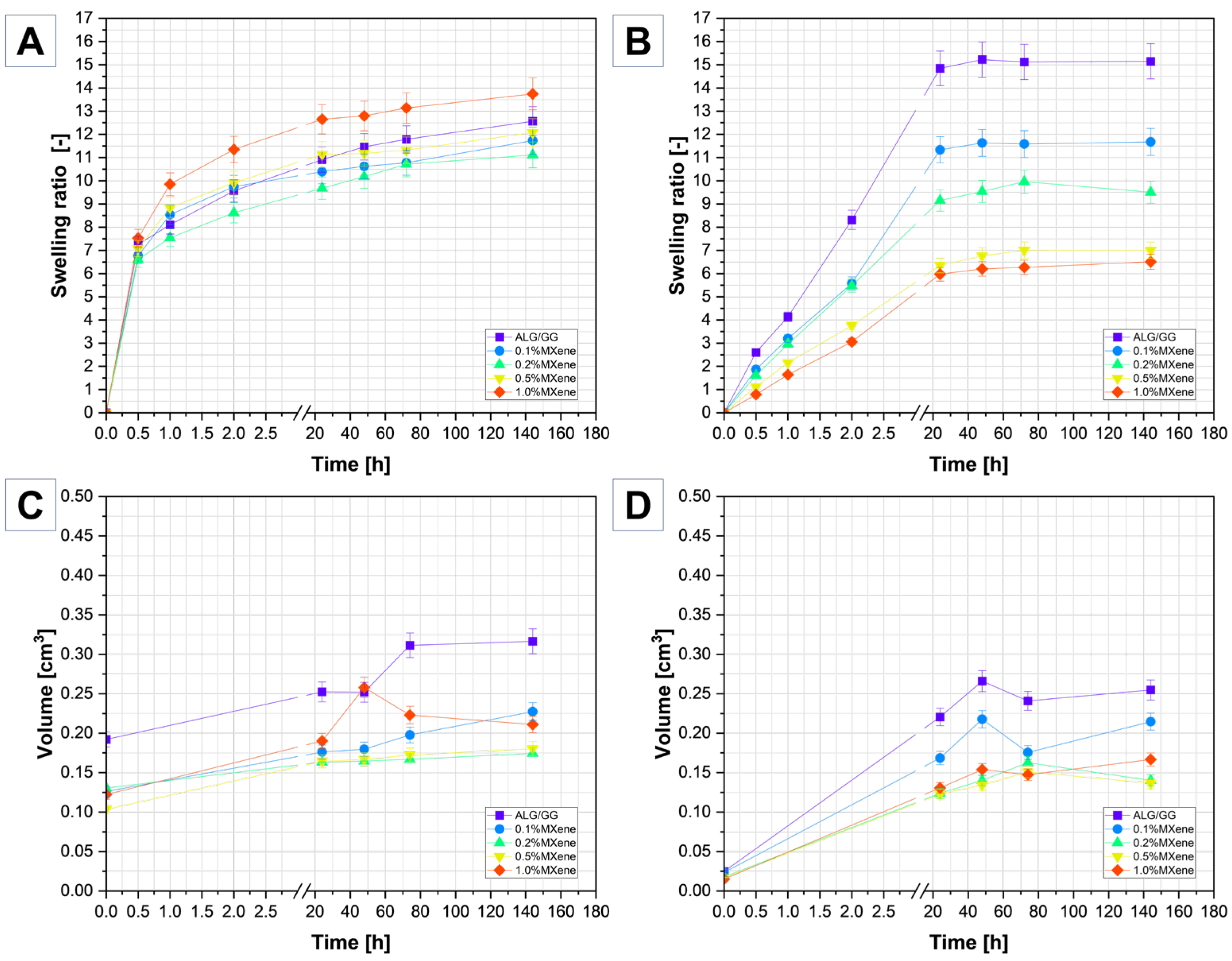 Figure 6C) the main change (especially in 0.5% and 1.0% of MXenes) is present within 24 h, in most of the samples the percentage increase continues, but the differences are not that big, except for 1.0% MXene sample, where the jump to ~110% is very noticeable, but after that some decrease is also present. This may indicate that the hydrogel expands quickly, but then partially contracts or stabilizes.