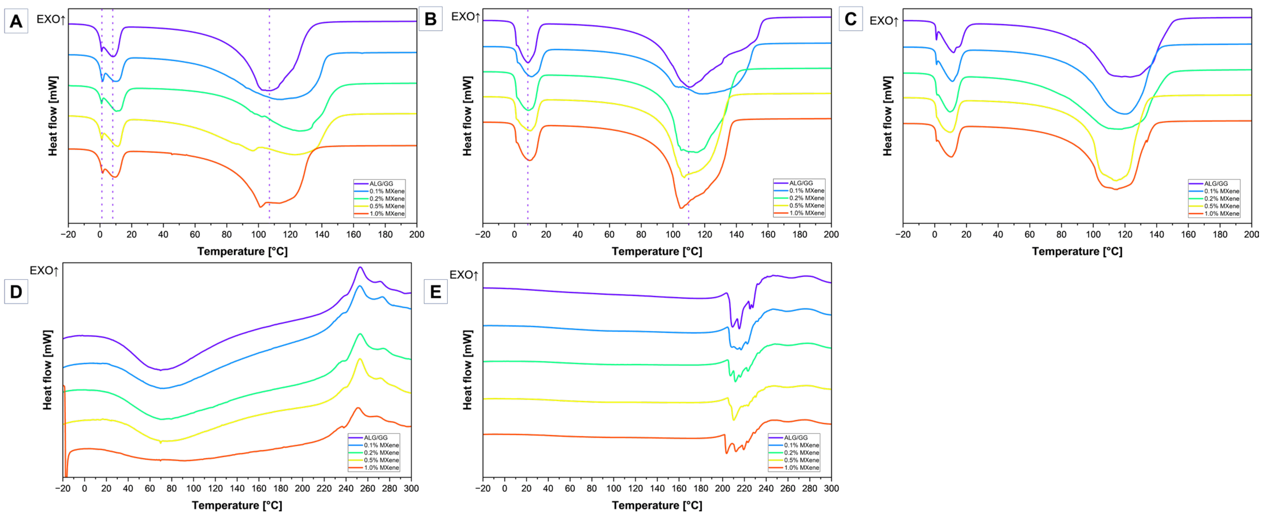 Figure 7A) corresponds to the evaporation of water, it begins at about 50–80 °C (depending on the type of sample) and ends at about 120–150 °C. The pure ALG/GG DSC curve exhibits only one almost symmetric, while the curves of hydrogels with MXenes addition change significantly. The temperature range for MXene-modified cross-linked hydrogels is broader (