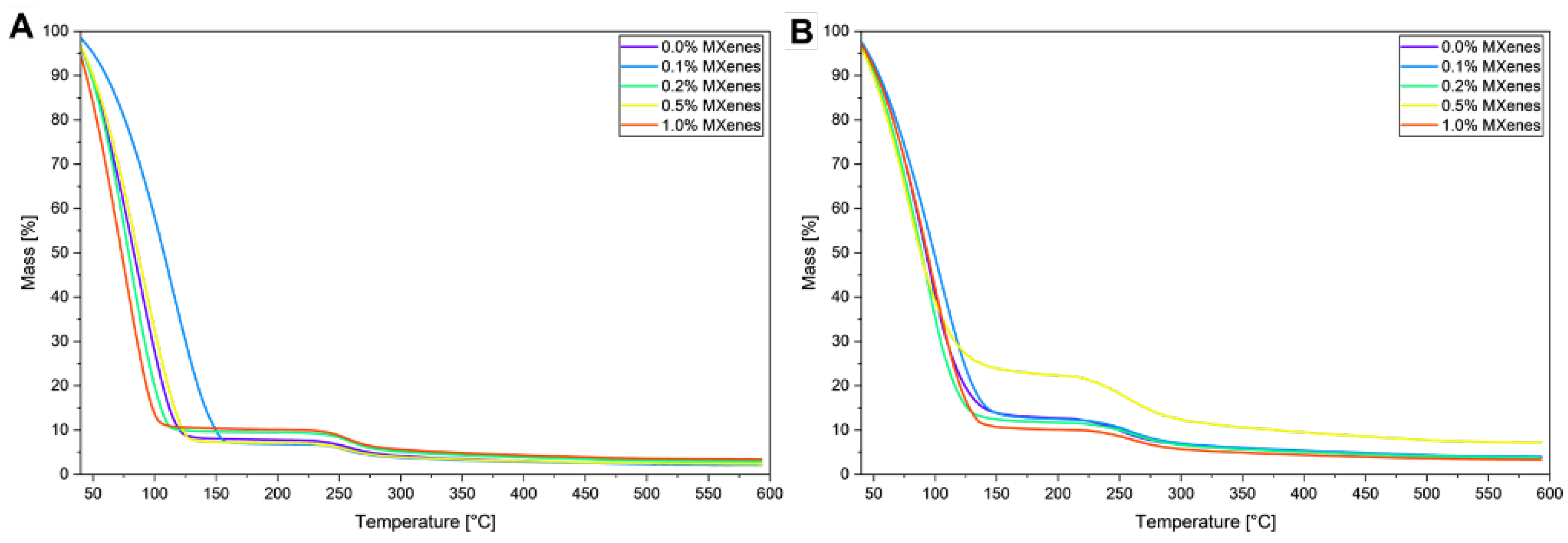 Table 3). On the other hand, low concentrations of MXene at the level of 0.1% cause a shift of mass loss toward higher temperatures. This effect may be attributed to the additional enhanced cross-linking density coming from small amounts of MXenes (but too small to increase thermal conductivity). Additional cross-linking forms tighter polymer chain traps inhibiting water molecules movements and evaporation, suggesting higher share water that interact with the polymer chain through hydrogen-bound [