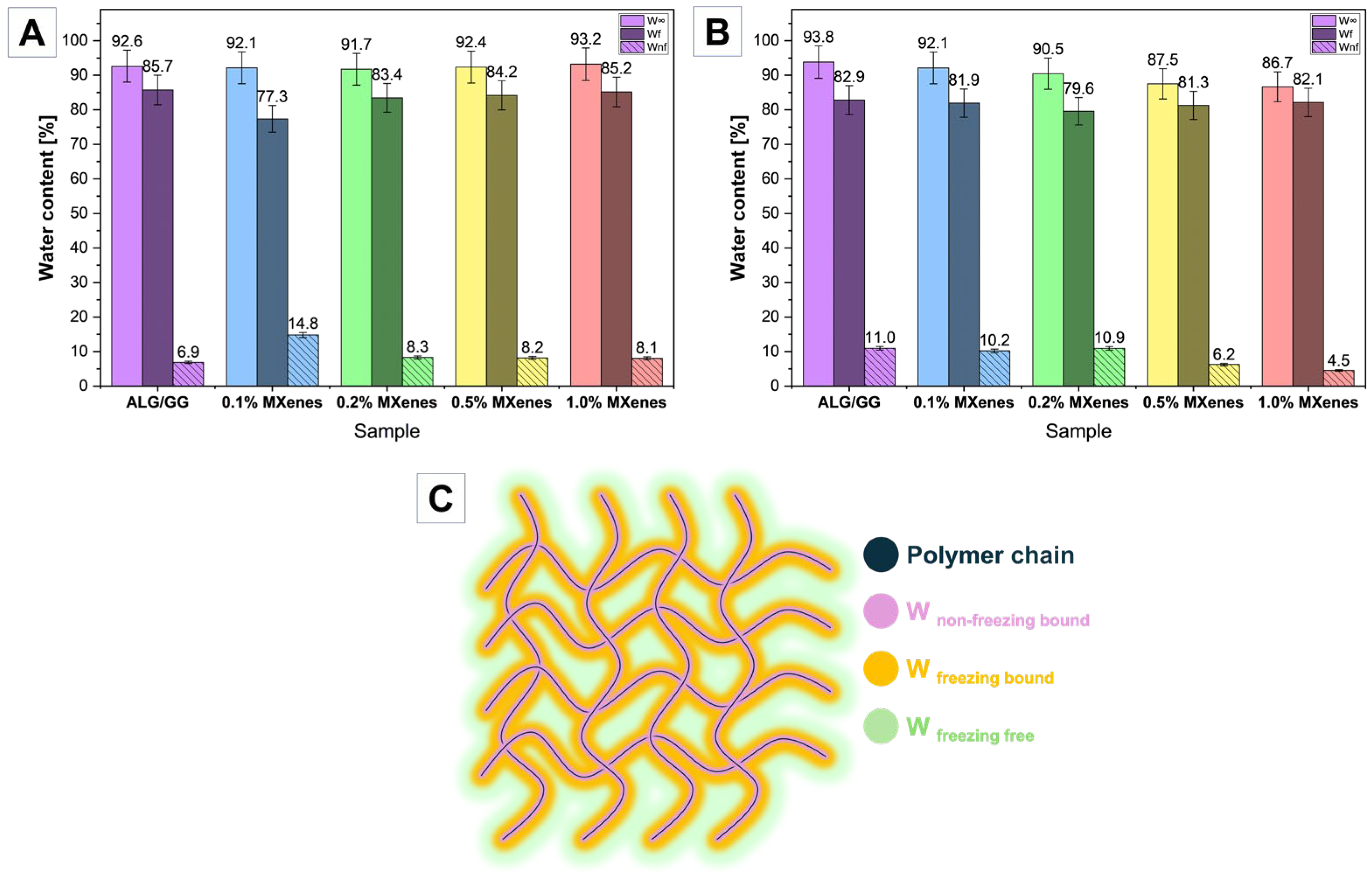 Figure 9A) exhibited similar values of water content ranging from 91 to 93%, with the highest value for 1.0% MXene sample. The share for the W
