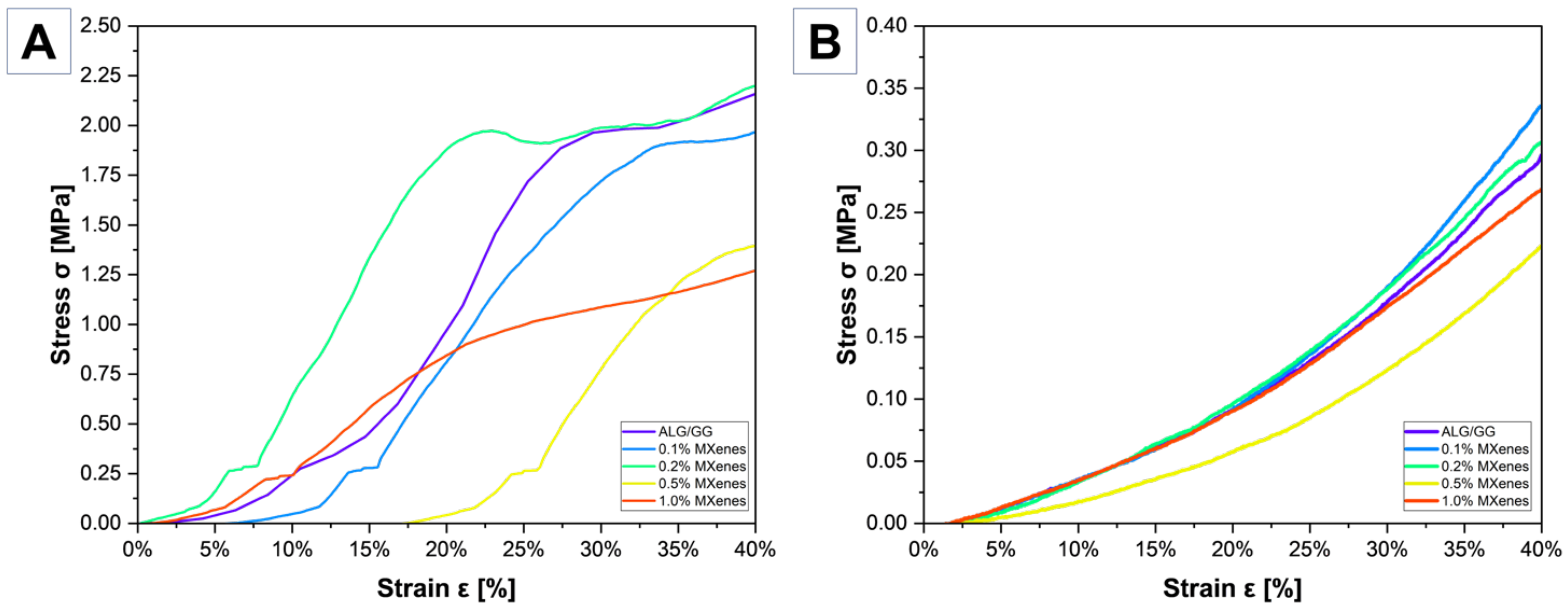 Figure 10A have characteristic irregularities, suggesting the fragility and porous structure of the freeze-dried samples. These irregularities are typical for brittle, foam-like xerogels in which compression causes progressive pore-wall failure. When the porous, freeze-dried network is loaded, individual cell walls buckle or fracture, producing characteristic drops or steps in the stress–strain curve. The stress-strain curve for ALG/GG shows numerous irregularities, and at a deformation of about 28% there is a sudden step, which may result from the porosity of the sample. This behavior confirms that the mechanical response is dominated by pore-wall instability. Such events are typical for brittle, porous biomaterials, where crack propagation occurs stepwise manner and is followed by partial densification of the structure as the pores collapse. Under the influence of the applied force, the structure above the pores could have cracked locally, which caused a visible step on the graph. The sample containing 0.2% MXene exhibits the highest compressive strength. Its curve shows an initially linear elastic region, indicating a uniform load transfer through the pore walls, followed by a transition to a plastic or densification zone at approximately 1.8 MPa. This behavior suggests that at 0.2% concentration, MXene nanosheets are sufficiently well dispersed to reinforce the xerogel structure by acting as load-bearing fillers and forming additional physical crosslinks (e.g., hydrogen bonding or van der Waals interactions) with the polysaccharide chains. As a result, the pore walls exhibit increased stiffness and resistance to failure.