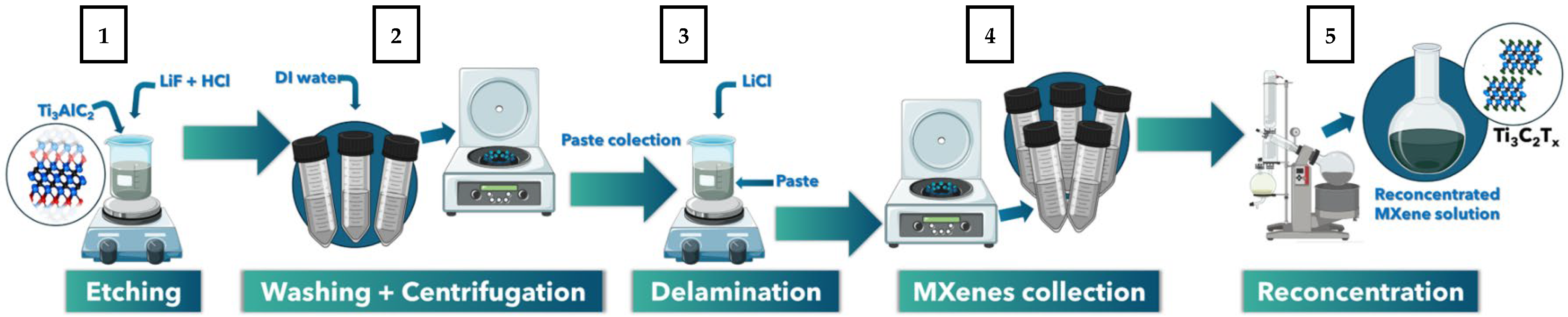 2 MAX phase was slowly added to the mixture. The reaction temperature was maintained in the range ~15–20 °C. After all of the MAX phase was added to the etching solution, the mixture was left for 24 h on the magnetic stirrer set up for 300 rpm and temperature of 35 °C. Subsequently, the obtained multilayer MXene paste was washed through the centrifugation process (2) to reach a supernatant of pH ~5. Then, the multilayered MXene paste was collected. The delamination process (3) was carried out with the addition of LiCl in weight proportion (1:1) as an interlayer delamination agent. The mixture was left in the closed beaker on the magnetic stirrer (300 rpm) in the water bath (35 °C) for 24 h. The MXene collection process (4) was performed by numerous centrifugation cycles and collection of the MXene supernant. Then, the MXene colloidal solution was reconcentrated with the rotary evaporator. The concentration of the reconcentrated solution (5) was determined to be 2,3 mg/mL. The process is schematically presented in
