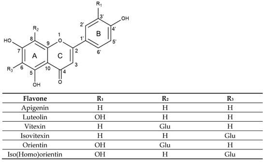 Vitexin and isovitexin are C-glucoside derivatives of apigenin, each containing one hydroxyl group at C4′ of the B aromatic ring. However, their chemical structure differs in the position of the glucose moiety at C8 or C6 of the A aromatic ring, respectively. On the other hand, orientin and isoorientin, also called homoorientin are C-glucoside derivatives of luteolin, holding two hydroxyl groups in C3′ and C4′ of the B aromatic ring and also differing in the glycosylation at C8 or C6 of the A aromatic ring, respectively.