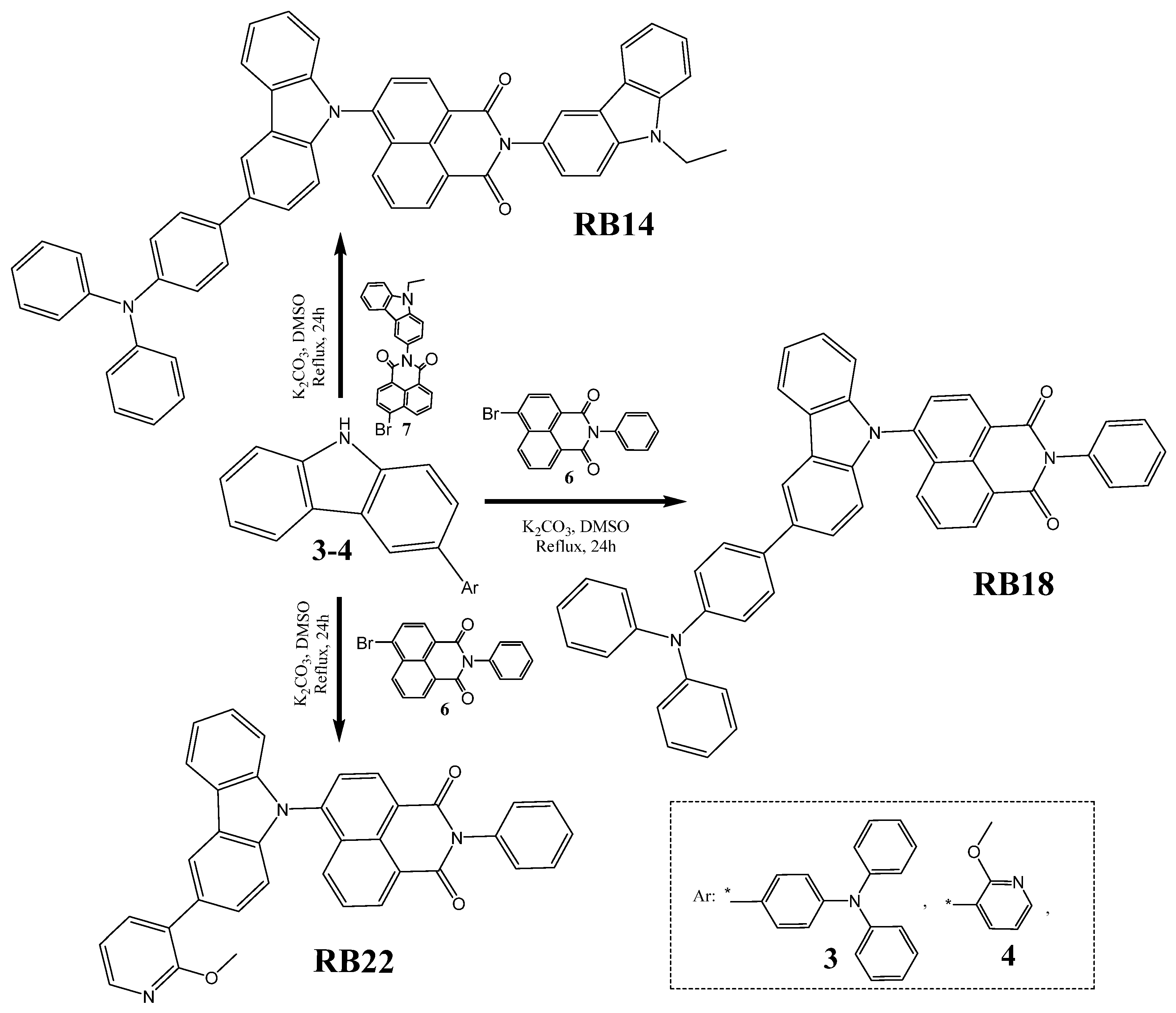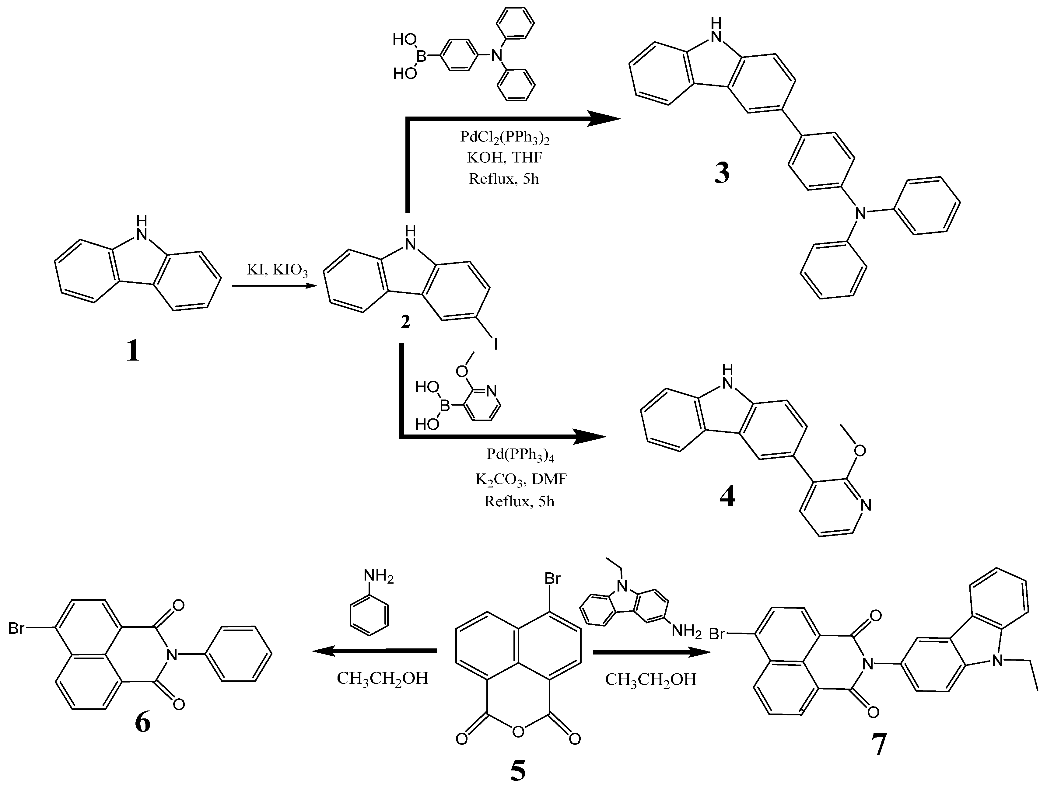 - Kagatikar, S.; Sunil, D. A systematic review on 1, 8-naphthalimide derivatives as emissive materials in organic light-emitting diodes. J. Mater. Sci. 2022, 57, 105–139. [Google Scholar] [CrossRef]