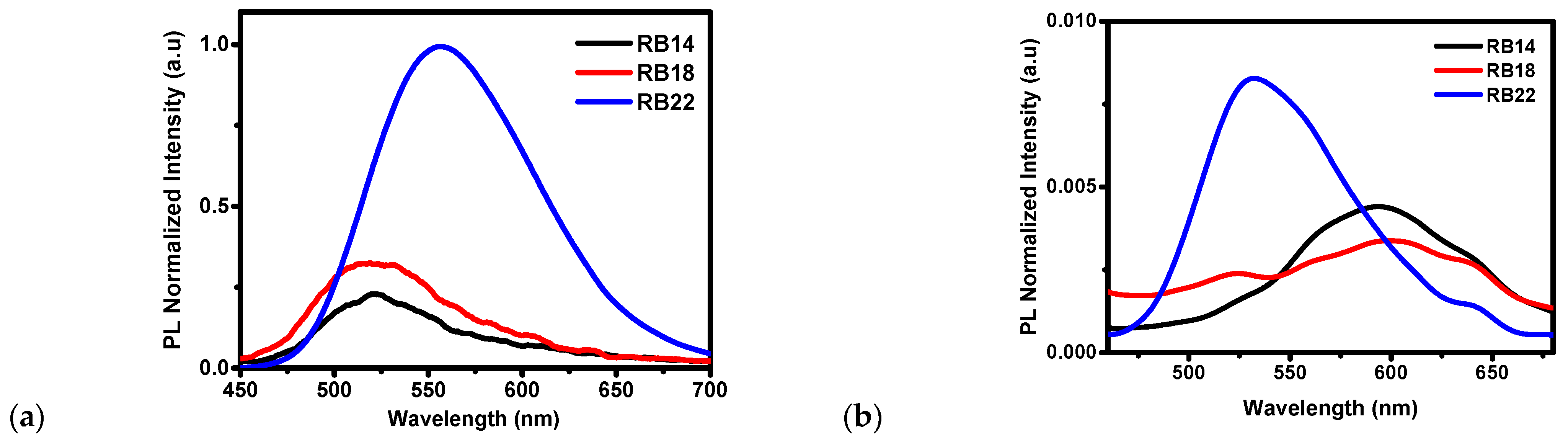 - Anamika Gupta, N.; Sharma, D.; Maurya, A.; Kumar, A.; Jou, J.H.; Kuila, B.K. Side-Chain Polarity-Dependent Photoluminescence and Deep Blue Electroluminescence in Fluorene-Based Conjugated Polymer Networks. ACS Appl. Polym. Mater. 2025, 7, 5672–5683. [Google Scholar] [CrossRef]