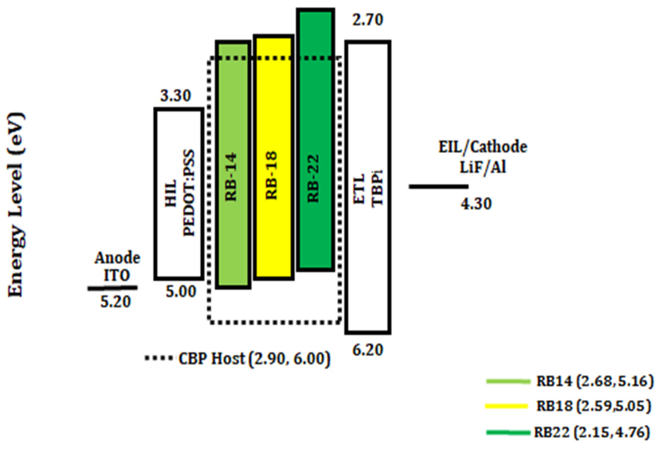 2.4. Structure and Characterization of Electroluminescent OLED Devices