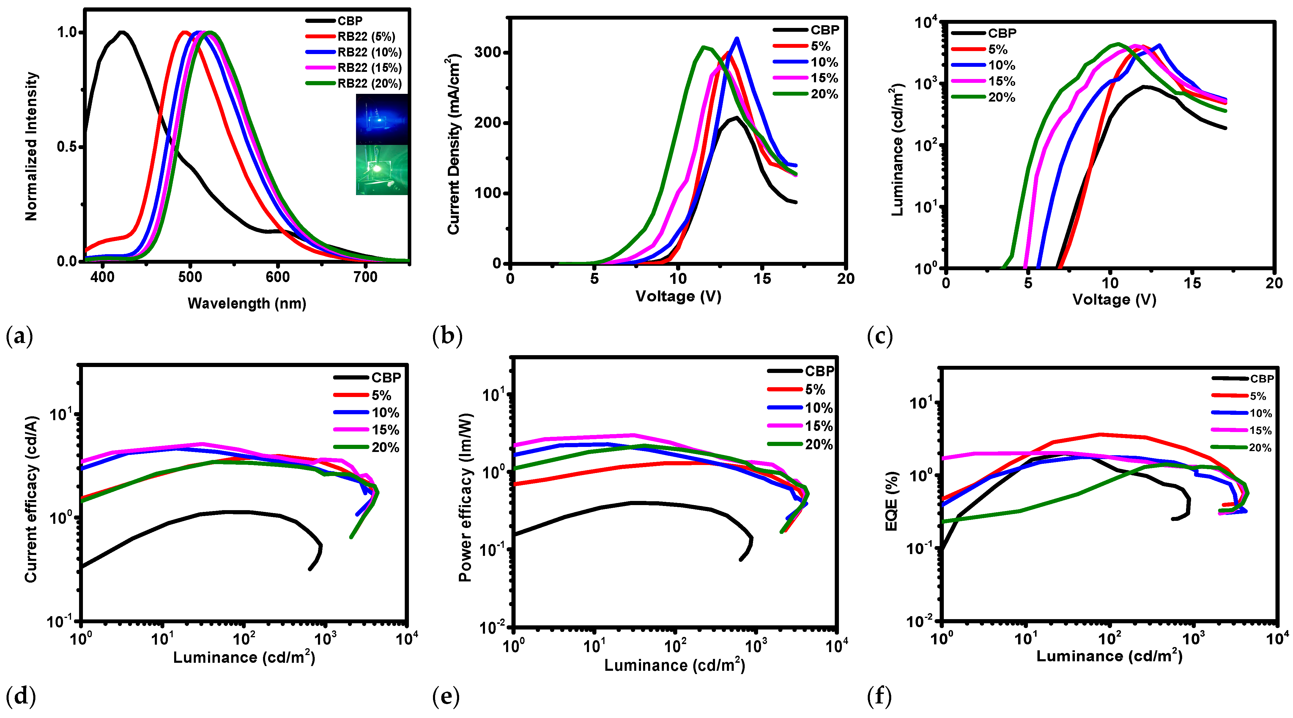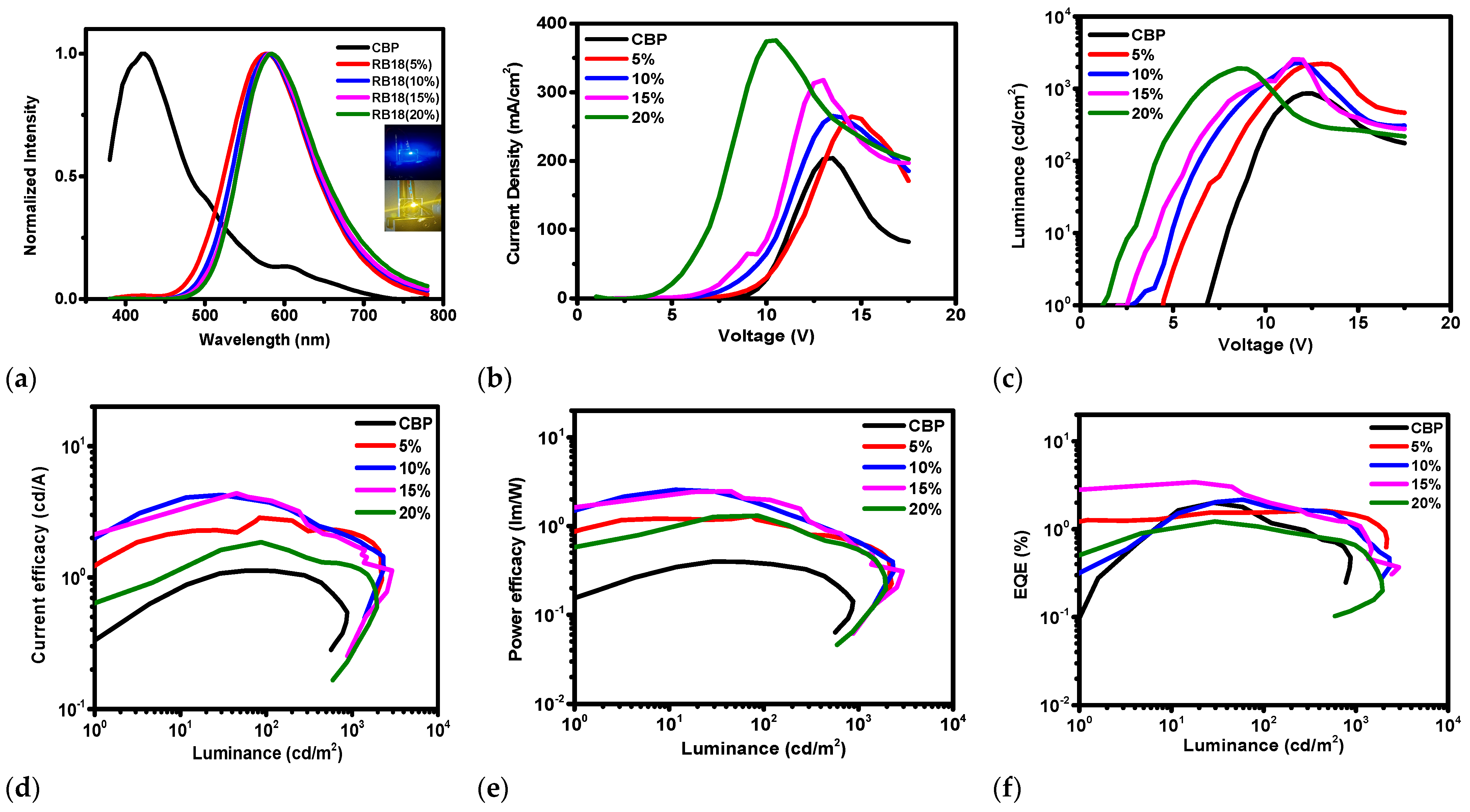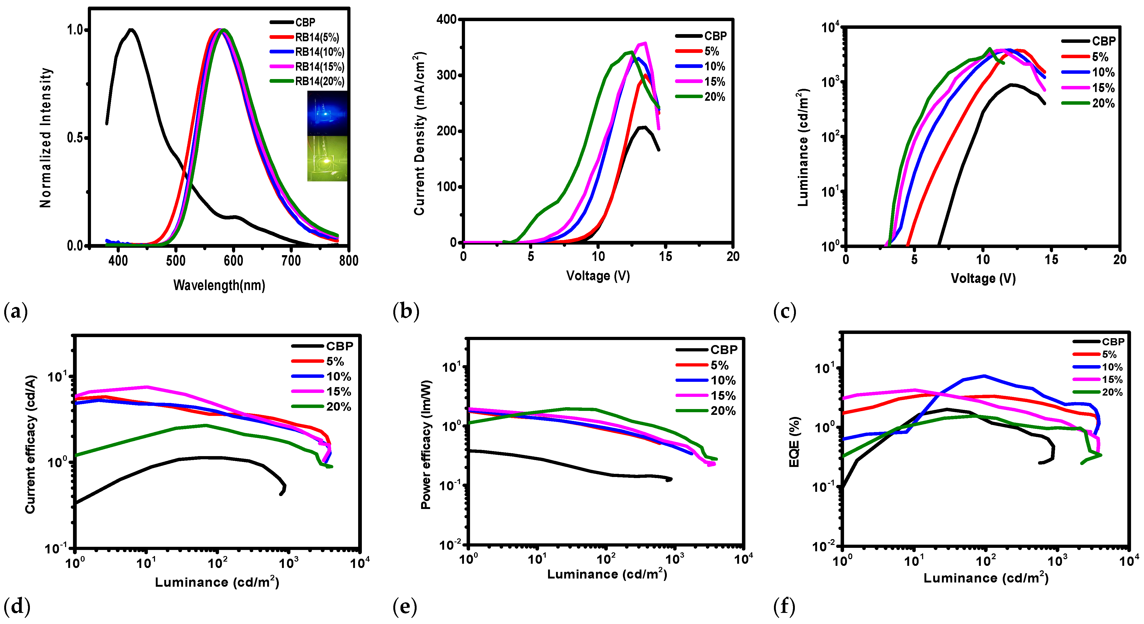 - Rayappa Naveen, K.; Prabhu, C.P.K.; Braveenth, R.; Hyuk Kwon, J. Molecular design strategy for orange red thermally activated delayed fluorescence emitters in organic light-emitting diodes (OLEDs). Chem.–Eur. J. 2022, 28, e202103532. [Google Scholar] [CrossRef] [PubMed]