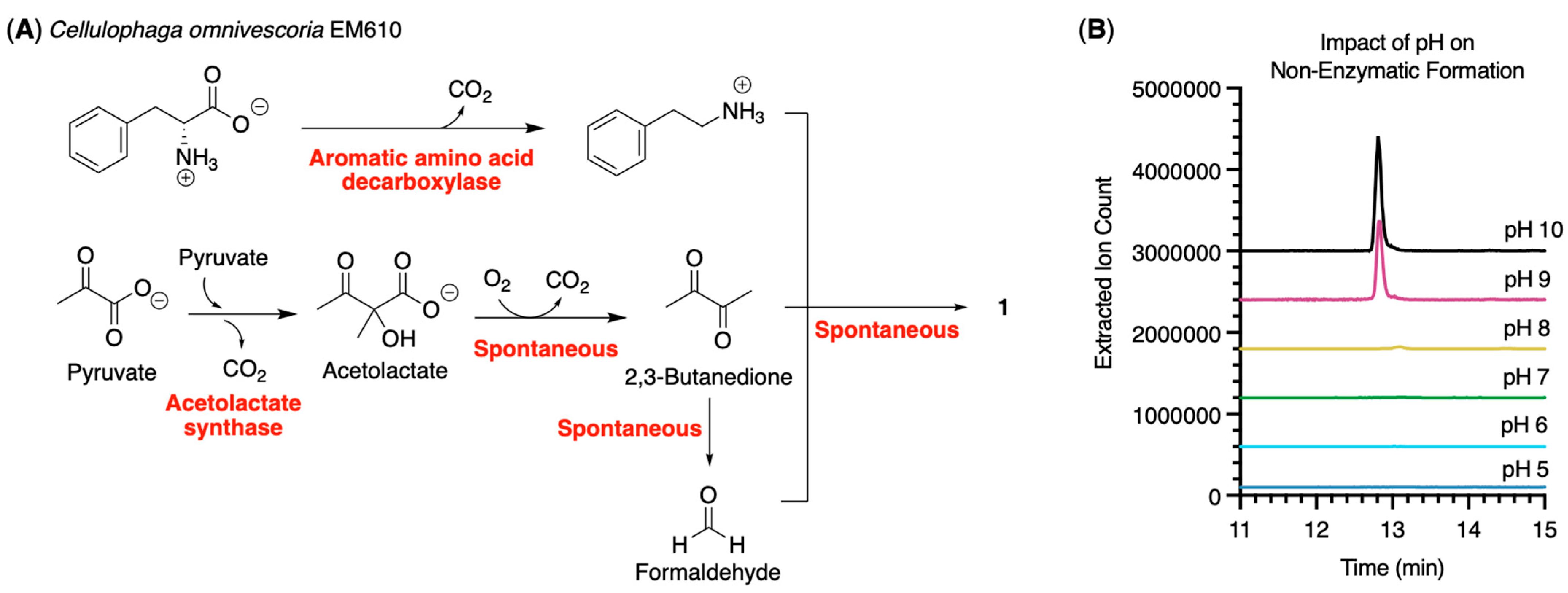 Figure 3. (A) Genome mining of C. omnivescoria EM610 revealed the presence of an aromatic amino acid decarboxylase (top reaction) and acetolactate synthase (bottom reaction). The absence of acetolactate decarboxylase indicates that the formation of 2,3-butanedione is spontaneous, leading to the spontaneous, non-enzymatic formation of 1 and related compounds (red text denotes enzymatic or spontaneous reactions); and (B) Non-enzymatic reactions performed at six different pH values showed that 1 formation occurs only under basic conditions (extracted ion count m/z 305.2).