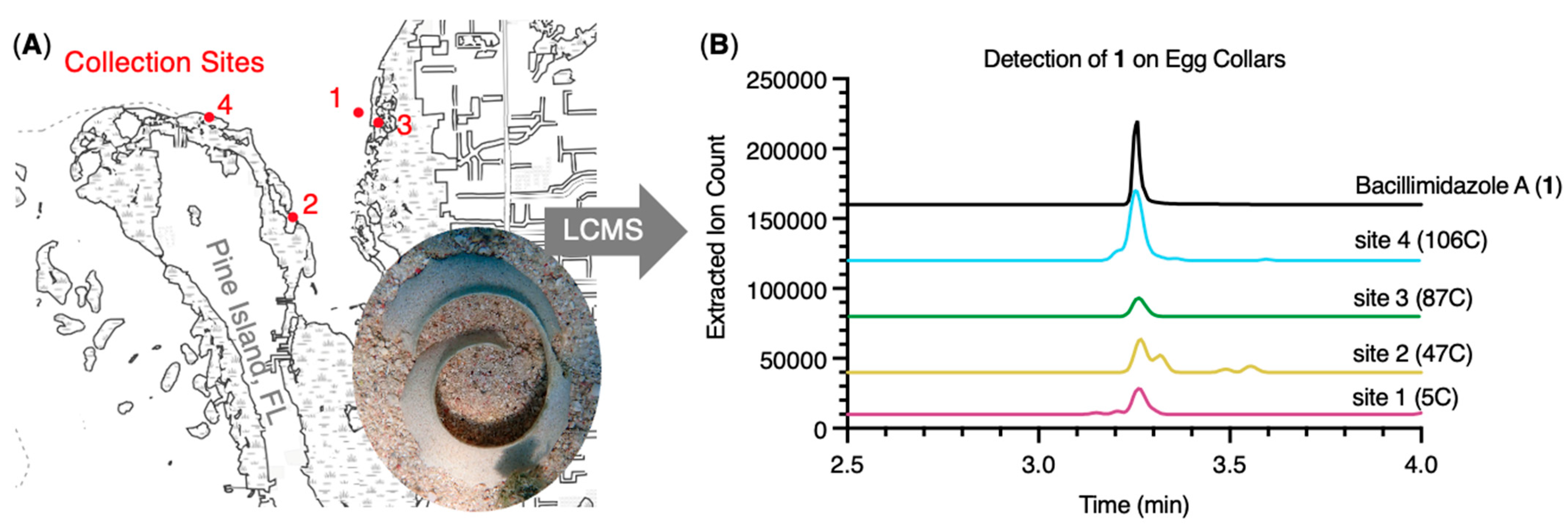 Egg Collar Collection and Sample Preparation: Moon snail egg collars belonging to Neverita delessertiana were collected from four sites in the Matlacha Pass Aquatic Preserve in SW Florida in January 2023 (site 1: 82°5′ 17.0″ W 26°42′ 12.462″ N, site 2: 82°6′ 37.54″ W 26°40′ 22.638″ N, site 3: 82°4′ 54.1″ W 26°42′ 1.4″ N, and site 4: 82°8′ 15.51″ W 26°42′ 10.662″ N) with permission from the Florida Wildlife Conservation (permit number: SAL-21-2113-SR). For each site, 10 egg collars were collected, placed in a Falcon tube, and stored at −20 °C. Individual egg collars were lyophilized for 24 h, then homogenized with a mortar and pestle, and extracted with acetone (5 mL) for 16 h at rt while shaking at 150 rpm. The organic layer was decanted and further extracted with MeOH (5 mL) for 4 h at rt. The combined organic layers were filtered through a glass pipette column celite plug and concentrated under vacuum. Dried extracts were stored at −20 °C until purification. A subset (16) of extracts (4 from each site) was semi-purified using a glass pipette column containing ~100 mg of C8 resin (Phenomenex Supra C8; 50 µm, 65 Å). Egg collar extracts were resuspended in ~0.5 mL 100% H2O and applied to the C8 plug and eluted with 3 mL of 100% H2O (fraction A), 75% H2O/25% MeOH (fraction B), and 100% MeOH (fraction C). Fractions were dried under vacuum, and then fraction C was analyzed by HR-LCMS using the following method. Using a Thermo Vanquish UPLC equipped with a Phenomenex 2 μm Kinetex Polar C18 column (100 × 2.1 mm, 100 Å) with Orbitrap Exploris 120 detector using the following solvent system: holding 5% CH3CN + 0.1% FA/95% H2O + 0.1% FA for 1 min then gradient to 25% CH3CN + 0.1% FA/75% H2O + 0.1% FA over 0.1 min, followed by a gradient to 100% CH3CN + 0.1% FA over 6.9 min holding 100% CH3CN + 0.1% FA for 2.5 min with a flow rate 0.5 mL/min. MS data were collected using a Thermo Exploris 120 in positive mode using Thermo Freestyle software. Electrospray ionization parameters were set to 50 L/min for sheath gas, 10 L/min for auxiliary gas, 1 L/min for sweep gas and 350 °C for auxiliary gas temperature. The spray voltage was set to 3500 V, the ion transfer tube temperature to 325 °C. MS1 data were collected from 150 to 2000 m/z with a resolution of 60,000 at m/z 200 with 1 micro scan. The maximum ion injection time was set to auto with an automatic gain control (AGC) target of standard. Tandem MS spectra were collected using data-dependent acquisition, targeted ion list for MS1 ion selection for fragmentation. HCD collision energy was set to 45. MS2 data were collected with a resolution of 15,000 at m/z 200 with 1 micro scan and an AGC set to standard.