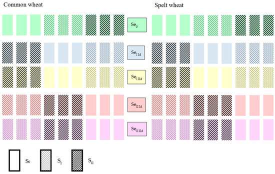 The experiment was designed as a three-factor system in a factorial design. The first factor included three levels of sulphur application: S0—0 kg S ha−1, S1—15 kg S ha−1 and S2—30 kg S ha−1. The second factor consisted of three levels of selenium supplementation: Se0—0 g Se ha−1, Se1—10 g Se ha−1 and Se2—20 g Se ha−1. The third factor referred to two selenium application dates, i.e., in the tillering phase (BBCH 22–24) and in the stem elongation phase (BBCH 31–34). Factors S and Se were introduced at three levels, while the application date was introduced at two levels, which enabled the analysis of interactions between the studied variables. The field experiment design is shown in Figure 1.