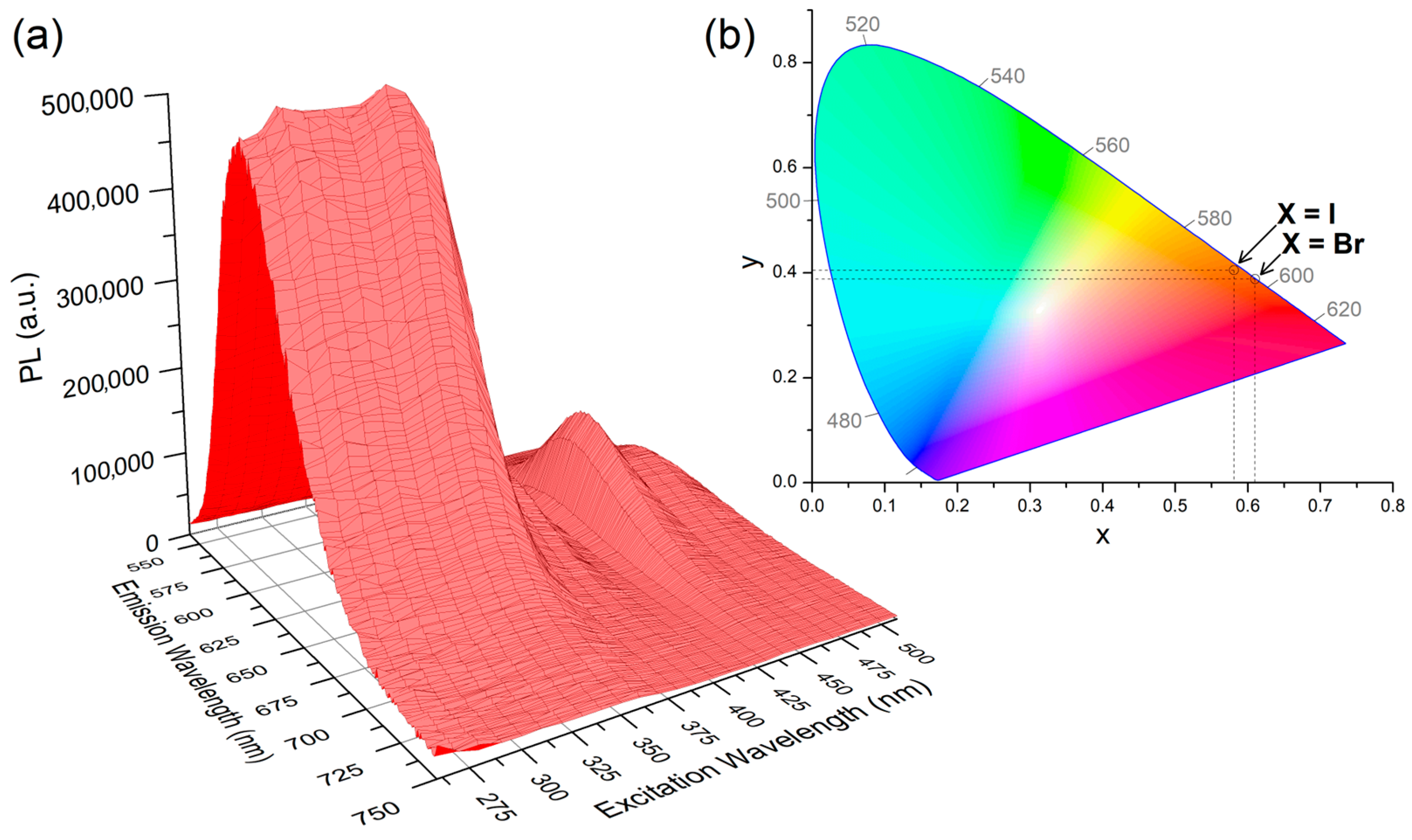 - Photoluminescence data for [MnI2{(PhN=PPh2)CH2}]. PL (solid, λexcitation = 280 nm, 298 K, nm): 598 (FWHM = 1900 cm−1) 4T1(4G)→6A(6S). CIE 1931: x = 0.581; y = 0.405. PLE (solid, λemission = 610 nm, 298 K, nm): <360 ligand-centred and metal-centred; 365–575 (local max 374, 403, 456, 491, 550) metal-centred. τ (solid, λexcitation = 300 nm, λemission = 600 nm, μs): 373 (T = 298 K).