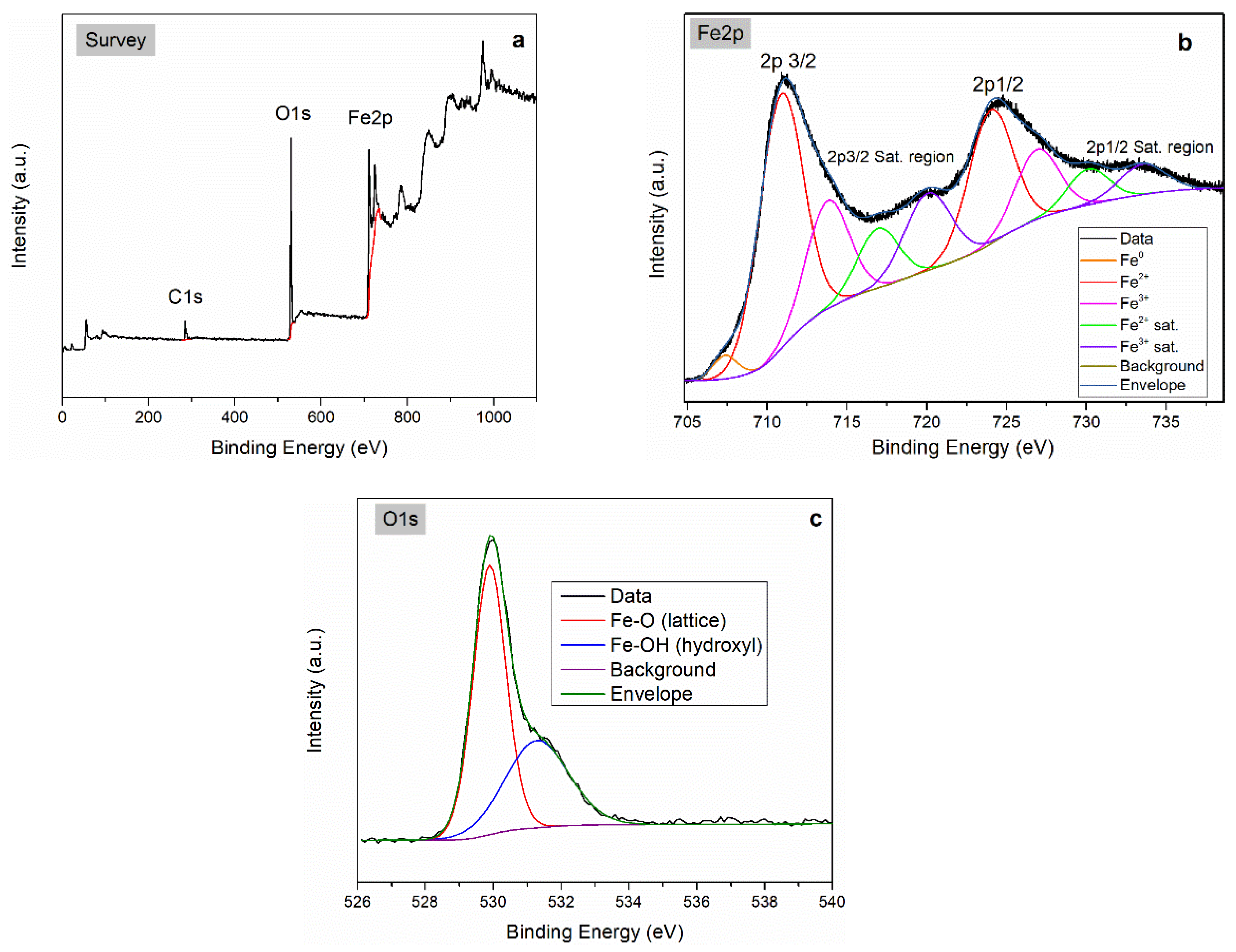 - Yamashita, T.; Hayes, P. Analysis of XPS spectra of Fe2+ and Fe3+ ions in oxide materials. Appl. Surf. Sci. 2008, 254, 2441–2449. [Google Scholar] [CrossRef]