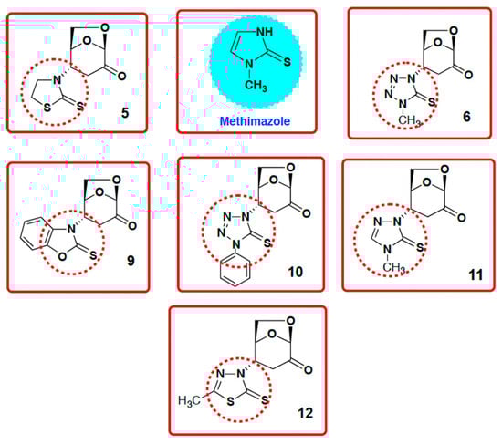 An observation of only N-addition of a similar compound (2-mercapto-benzoxazole) to levoglucosenone was previously reported by Spanevello et al. [8]. Recently, 2-mercapto-benzoxazole and 2-mercapto-benzothiazole were used in a Michael addition reaction to α,β-unsaturated esters [9]. Various aspects of thiono-thiol tautomerism of thiadiazole and oxadiazole have also been reported [10,11]. These data and our earlier observation of tautomeric nucleophile 4-thioxo-pyridine acylation [12] prompted us to further investigate the reactivity of enolizable/tautomeric imino-thiols. Interestingly, some substituted thioureas belonging to enolizable/tautomeric imino-thiols are well known FDA-approved drugs, such methimazole (Thiamazole) or propylthiouracil (Propycil), both used to treat hyperthyroidism (Figure 1). Drug disposition, delivery, and toxicity are known to be influenced by the presence of tautomers in some drugs and also by their respective metabolites [13,14].
