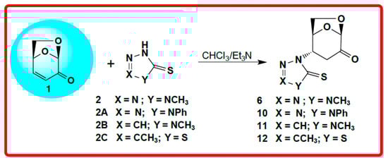Other authors [18] synthesized relevant N-adducts via Michael reaction addition to levoglucosenone under aqueous conditions. Interestingly, several of the synthesized levoglucosenone N-adducts exhibited promising properties against disorders such as cancer, autoimmune, and heart diseases. Greatrex et al. [19] published some new data on the synthesis of aza LG adducts from the reaction with reactive amines. Mroczek et al. [20] reported some chromatographic characteristics of tautomers of 1,2,4-triazole-3-thione and 3-thiol tautomers. Mloston et al. [21] recently published important studies of the reactivity of enolizable 1-substituted 5-mercapto-1H-tetrazoles in the cycloaddition reaction with dimethyl 2-arylcyclopropane dicarboxylates. Ring-opening reactions of donor–acceptor cyclopropanes with enolizable aza-heterocyclic thiones were also reported [22]. Published studies on 1H-benzo[d]imidazole-2-thiols [23] and 2-thioxo-4-thiazolidinone [24] present interesting applications and discuss their structural features and reactivities.