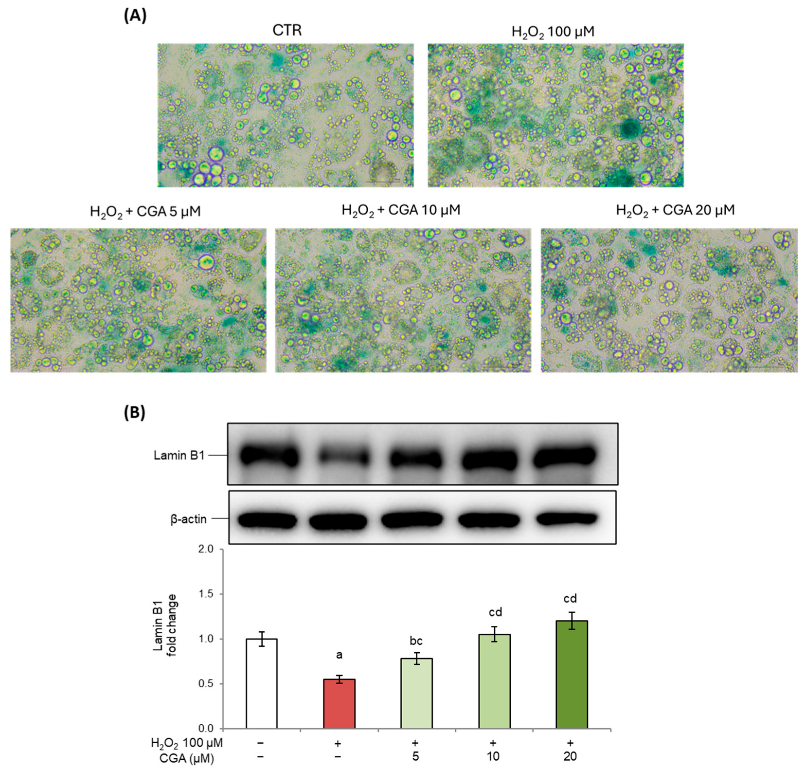 2.1. Chlorogenic Acid Reduces Cellular Senescence in Adipocytes