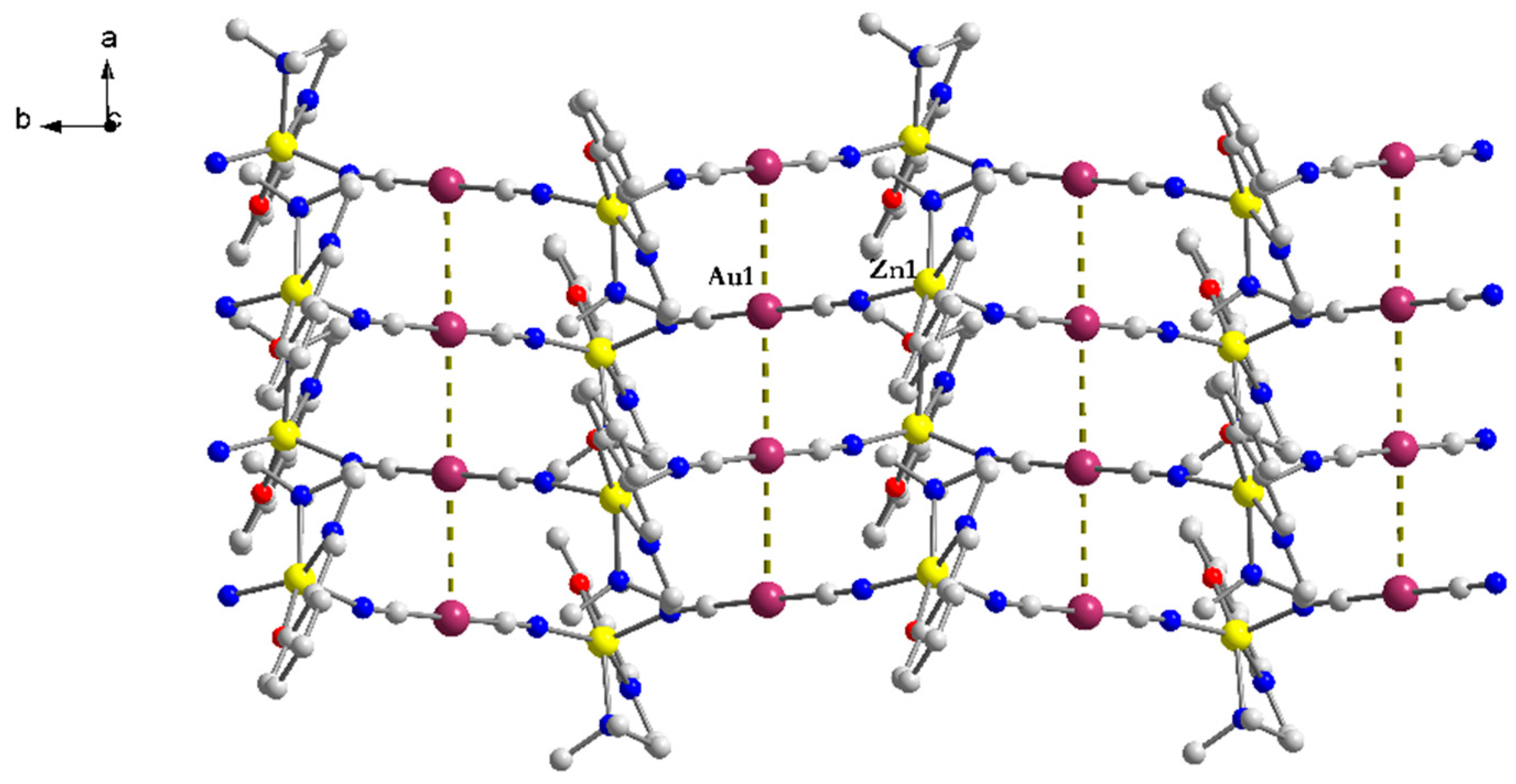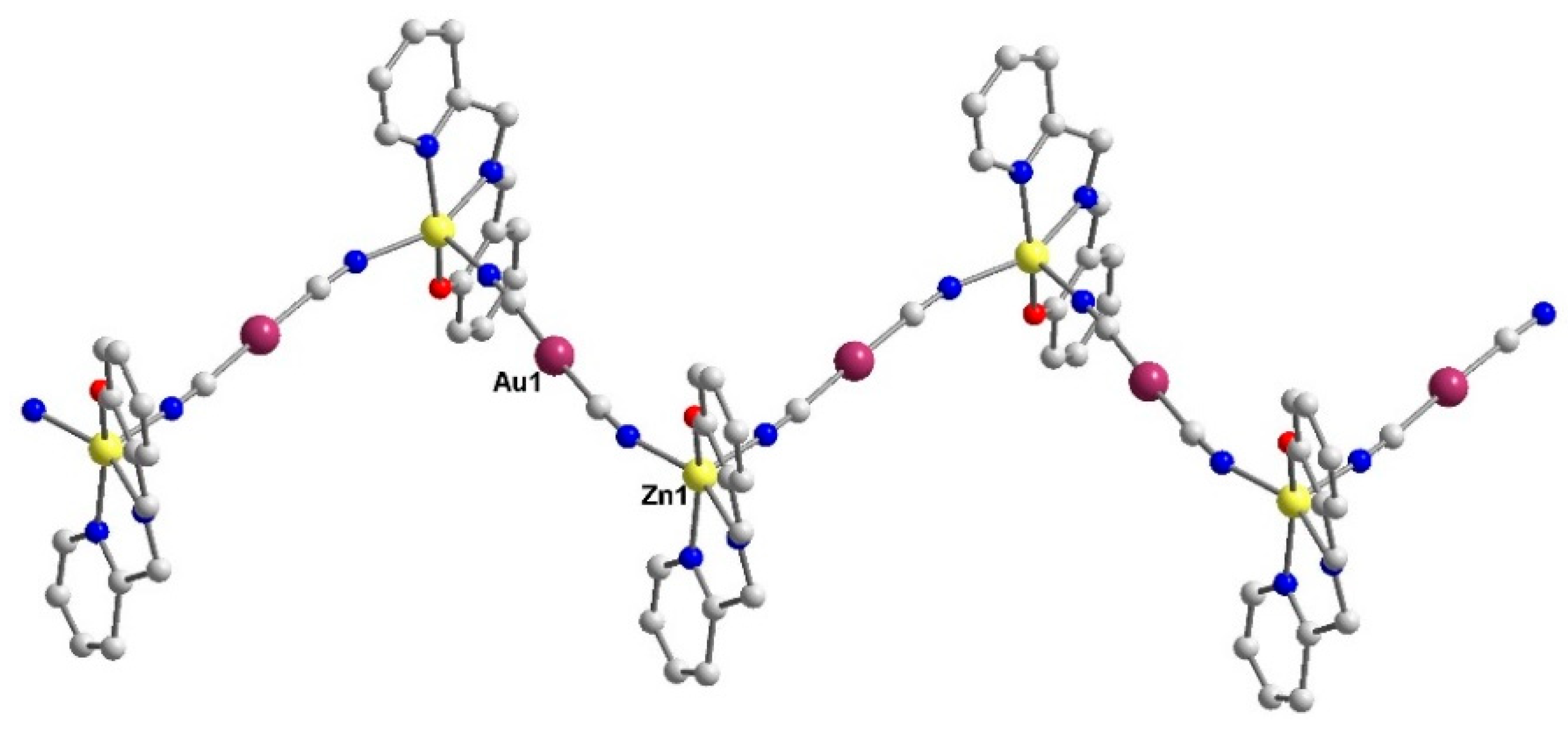 - Baril-Robert, F.; Li, X.; Katz, M.J.; Geisheimer, A.R.; Leznoff, D.B.; Patterson, H. Changes in Electronic Properties of Polymeric One-Dimensional {[M(CN)2]−}n(M = Au, Ag) Chains Due to Neighboring Closed-Shell Zn(II) or Open-Shell Cu(II) Ions. Inorg. Chem. 2011, 50, 231–237. [Google Scholar] [CrossRef]