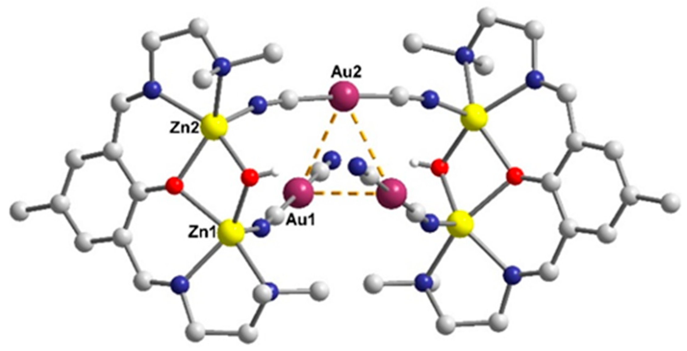 - Zhivkova, T.; Culita, D.C.; Abudalleh, A.; Dyakova, L.; Mocanu, T.; Madalan, A.M.; Georgieva, M.; Miloshev, G.; Hanganu, A.; Marinescu, G.; et al. Homo- and Heterometallic Complexes of Zn(II), {Zn(II)Au(I)}, and {Zn(II)Ag(I)} with Pentadentate Schiff Base Ligands as Promising Anticancer Agents. Dalton Trans. 2023, 52, 12282–12295. [Google Scholar] [CrossRef]