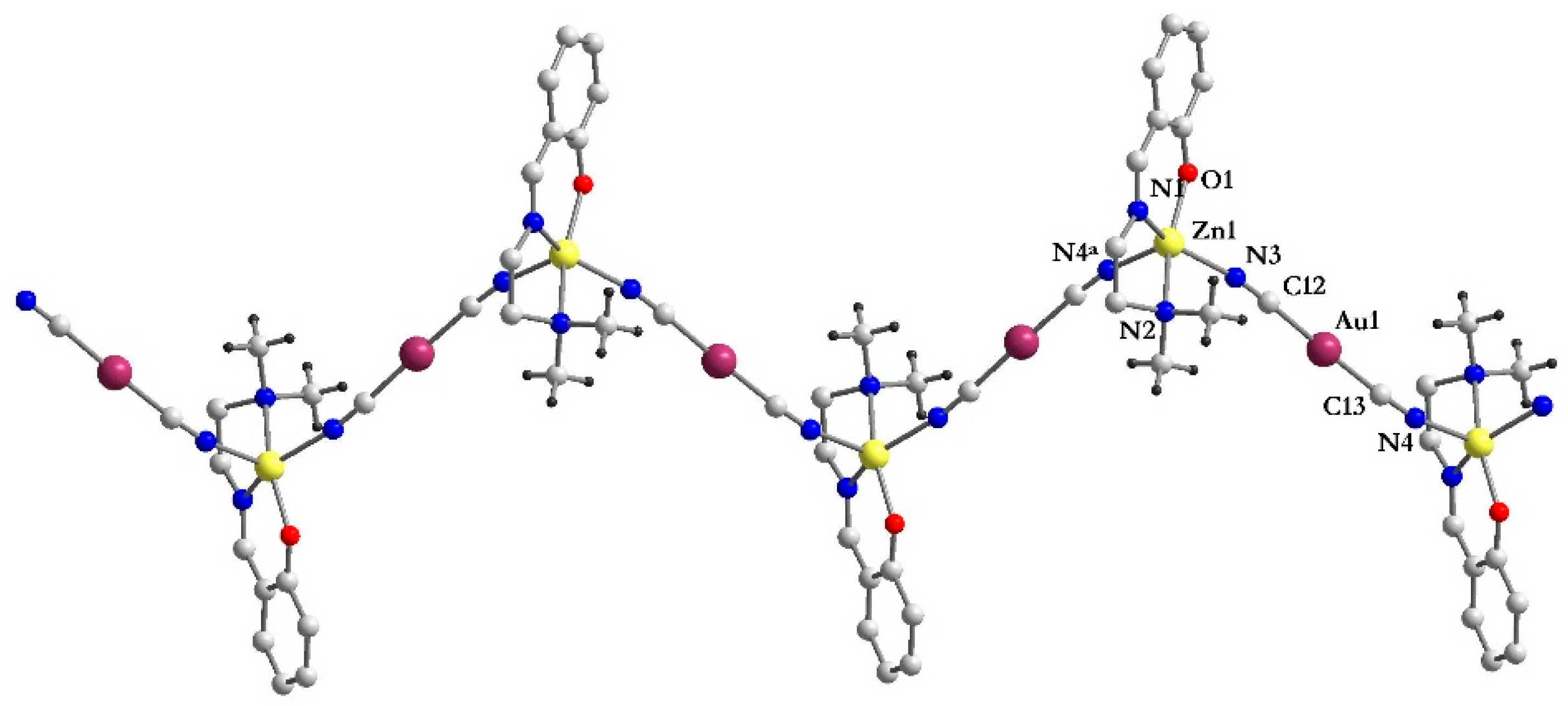 - Marinescu, G.; Madalan, A.M.; Andruh, M. New Heterometallic Coordination Polymers Based on Zinc(II) Complexes with Schiff-Base Ligands and Dicyanometallates: Synthesis, Crystal Structures, and Luminescent Properties. J. Coord. Chem. 2015, 68, 479–490. [Google Scholar] [CrossRef]