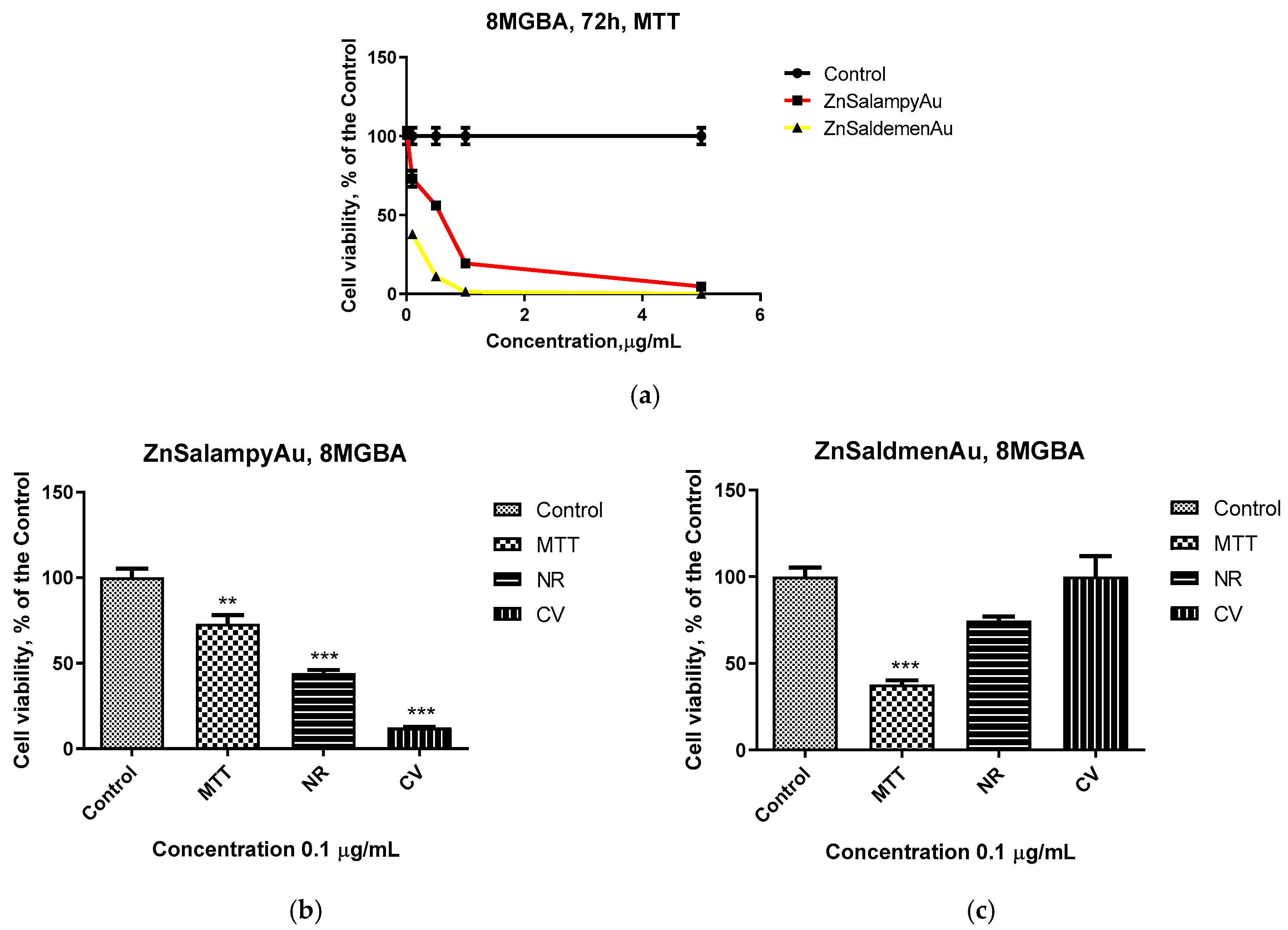 | ZnSalampyAu | MTT | n.da. | n.da. | 1.10 ± 1.2 * (6.72) ± 2.4 ** | 1.5 ± 0.9 (7.1 ± 2.3) | 0.57 ± 1.8 (0.89 ± 1.6) |
