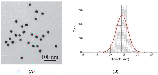 The average hydrodynamic diameter of the resulting nanoparticles, determined by dynamic light scattering (see Figure S1 (Supplementary Materials)), was 28.2 nm. The size distribution had no additional peaks, further indicating the monodispersity of the preparation and the absence of nanoparticle aggregation.