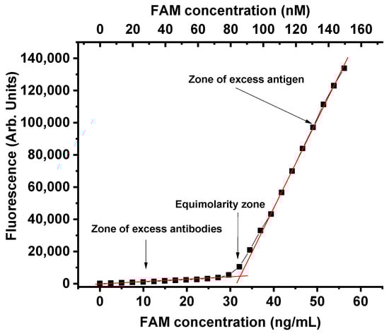 The characterization of the fluorescein–anti-fluorescein pair was started by titrating the antibodies through the successive addition of aliquots of 5-carboxyfluorescein (FAM), which is a molecular form of fluorescein. Figure 2 displays three clearly distinguishable ranges on the titration curve, representing zones of excess anti-FAM antibodies, approximately equal concentrations of immunoreagents, and excess antigen (FAM). The fluorescence signal in the first and third zones depended linearly on the FAM concentration. In contrast, near the equimolar point, a deviation from both linear dependencies was observed.