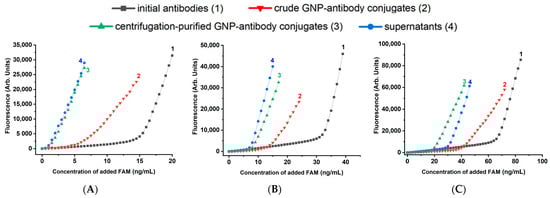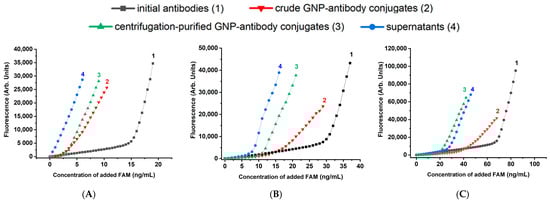FAM fluorescence in solutions of initial antibodies (1), reaction mixtures after mixing the antibodies and GNPs (2), purified antibody-GNP conjugates (3), and supernatants after centrifugation of the conjugates (4), obtained at anti-FAM antibody concentrations: 5 μg/mL (A), 10 μg/mL (B), and 20 μg/mL (C). Stabilizer—0.25% PEG-SH.