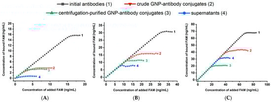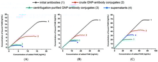 Dependence of the concentration of bound FAM on the initially added one for: initial antibodies (1), crude GNP-antibody conjugates (2), centrifugation-purified GNP-antibody conjugates (3), and supernatants (4) at anti-FAM antibody concentrations: 5 μg/mL (A), 10 μg/mL (B); and 20 μg/mL (C). Stabilizer—0.25% PEG-SH.