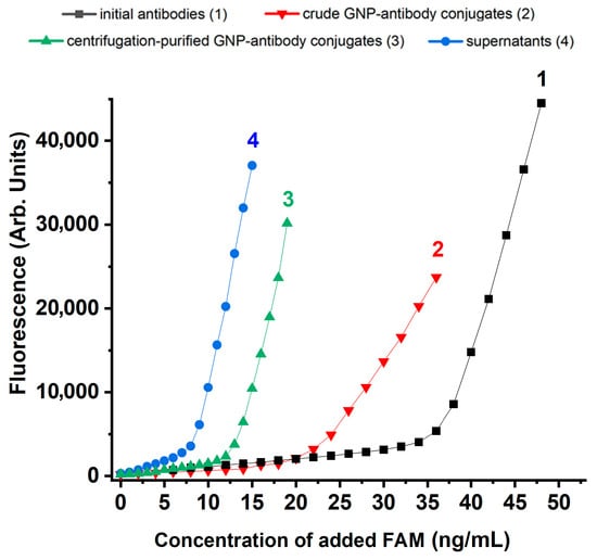 To confirm the absence of nonspecific interactions of FAM with BSA and PEG-SH adsorbed on the surface of GNPs, an additional experiment was conducted. The fluorescence of GNP-BSA 0.25% and GNP-PEG-SH 0.25% solutions in the absence of antibodies was measured with the addition of various concentrations of FAM. The obtained dependences (see Figure S2 in the Supplementary Materials) show that fluorescence depends linearly on the FAM concentration. This confirms the absence of nonspecific binding of FAM. to BSA and PEG-SH.