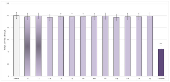 The newly obtained target compounds did not exhibit statistically significant MAO-A inhibitory activity, with only the classical MAO-A inhibitor Clorgiline reducing enzyme activity by 55% relative to the control (pure hMAO-A) (Figure 2).