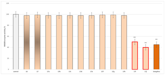 Within the evaluated molecules, two compounds, 17i and 17j, exhibited statistically significant MAO-B inhibitory activity, with 17j demonstrating superior MAO-B inhibitory activity compared to Selegiline (Figure 3).