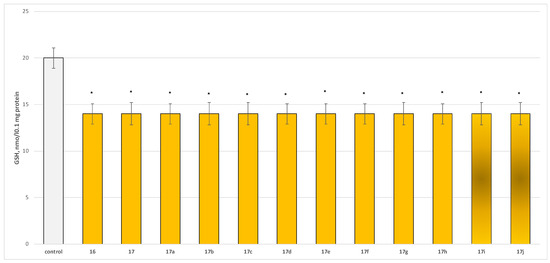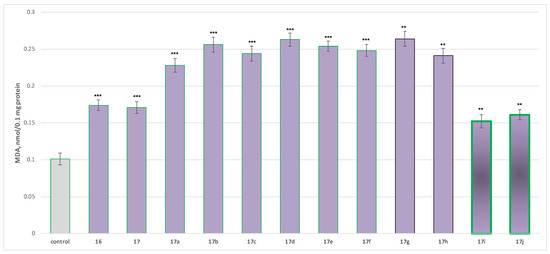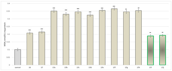 The tested compounds 17a increased MDA production by a statistically significant 248%; 17b by 228%, 17c by 243%, 17d by 222%, 17e by 251%, 17f by 262%, 17g by 243%, 17h by 250%, 17i by 87%, 17j by 91%, 17 by 106%, and 16 by 113% relative to the control (untreated microsomes) (Figure 8).