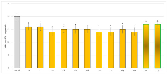 As the results indicate, tested compounds 17a, 17e, 17f, and 17h decrease the reduced glutathione (GSH) levels by ~30%; 17b, 17c, 17d, and 17g by ~25%; 17i and 17j by ~15%; and 17 and 16 by ~20% relative to untreated mitochondria (Figure 6).