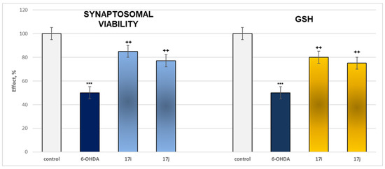 Effects of the most active representatives (at a concentration of 100 μM) in the model of 6-OHDA-induced neurotoxicity on parameters characterizing the functional–metabolic profile of synaptosomes, measured as synaptosomal viability and levels of reduced glutathione (GSH). *** p < 0.001 against the control (untreated synaptosomes); ++ p < 0.01 against the toxic agent (pure 6-OHDA).