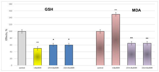 Effects of the most active representatives (at a concentration of 100 μM) in the model of t-BuOOH-induced neurotoxicity on parameters characterizing the functional–metabolic profile of mitochondria, measured as effects on levels of reduced glutathione (GSH) and production of MDA. *** p < 0.001 against the control (untreated mitochondria); + p < 0.05 and ++ p < 0.01 against t-BuOOH.