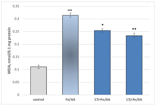 Effects of the most active representatives (at a concentration of 100 μM) in the model of Fe2+/AA-induced oxidative stress on parameters characterizing the functional–metabolic profile of microsomes, measured as effects on the production of MDA. *** p < 0.001 against the control (untreated microsomes); + p < 0.05 and ++ p < 0.01 against the toxic agent Fe2+/AA.