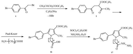 In the next step, the pyrrole-based acid (0.007 mol) is esterified by reacting with thionyl chloride and absolute ethanol to obtain the corresponding intermediate ester. Subsequently, the N-pyrrolylcarboxylic acid ethyl ester without purification (5-(5-(4-bromophenyl)-3-(ethoxycarbonyl)-2-methyl-1H-pyrrol-1-yl)pentanoic acid) reacted with an excess of hydrazine hydrate to give the new pyrrole hydrazide 17 (ethyl 5-(4-bromophenyl)-1-(5-hydrazinyl-5-oxopentyl)-2-methyl-1H-pyrrole-3-carboxylate) in 20 mL of absolute ethanol.