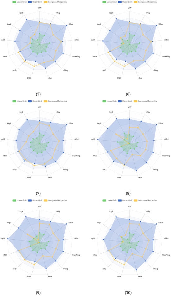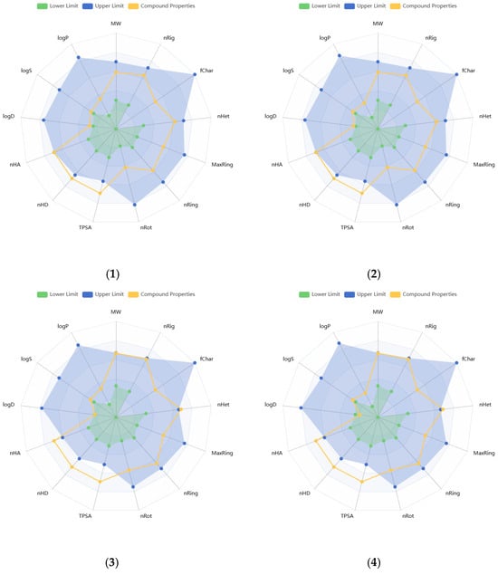 ADME profiles of the compounds were evaluated using ADMETlab 3.0-2025 [36,37]. Isomeric SMILES of each compound were employed for this evaluation. Structural and physicochemical properties, including MW, density, volume, solubility (logS, logP, logD 7.4, pKa acid and base), melting and boiling points, and molecular descriptors such as the number of Hacc, Hdon, rotatable bonds, and ring characteristics, were analyzed. Medicinal chemistry profiles, including QED, Lipinski’s Rule of Five, Pfizer’s Rule, GSK’s Rule, and the Golden Triangle Rule, were investigated. ADMETLab 3.0 has explained these rules as follows: Lipinski’s Rule MW ≤ 500, logP ≤ 5, Hacc ≤ 10, Hdon ≤ 5; Pfizer’s Rule logP > 3, TPSA < 75; GSK’s Rule MW ≤ 400, logP ≤ 4; the Golden Triangle Rule 200 ≤ MW ≤ 500, −2 ≤ logD ≤ 5. Caco-2, MDCK, and PAMPA permeability, P-gp inhibitor or substrate status, human intestinal absorption rate, and oral bioavailability (20%, 30%, and 50%) were evaluated to assess absorption. PPB, BBB, VDss, Fu, inhibitor effects on MRP1, OATP1B1, and OATP1B3 were investigated to determine distribution. The inhibitory or substrate impacts on various CYPs, including CYP3A4, 1A2, 2C9, 2C19, 2D6, 2B6, 2C8, and their human liver microsomal stability were investigated to evaluate metabolism. CLplasma and T1/2 were performed to determine excretion.