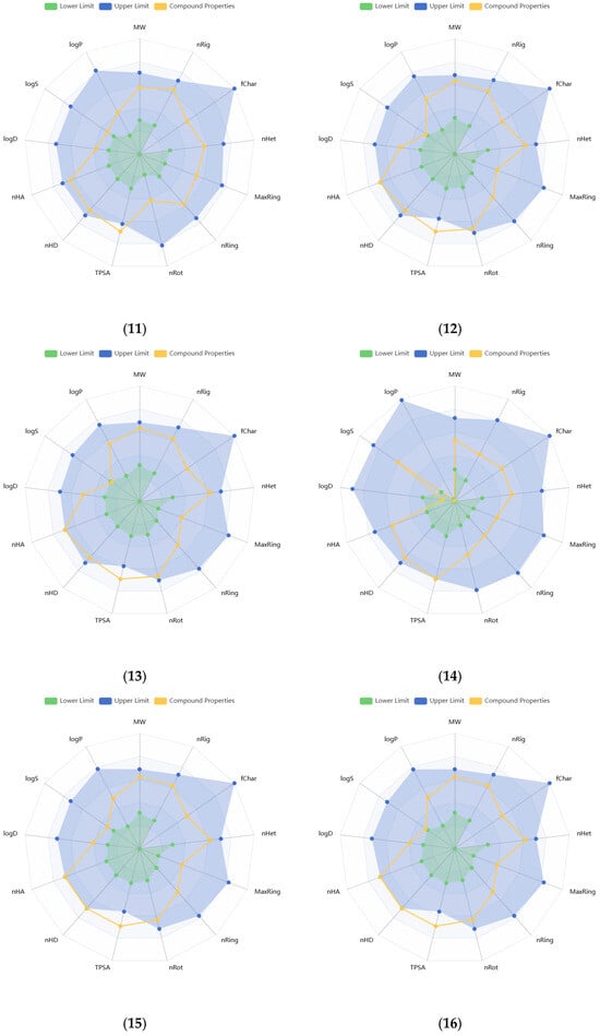 Radar plots of oral bioavailability and physicochemical properties of the isolated compounds (1–16).